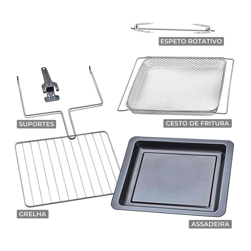 Agora, comer bem todos os dias, com mais sabor, mais variedade e sem abrir mão da saúde, ficou fácil e rápido! Ichef OvenFryer Max chega para resolver um dos grandes dilemas da vida moderna: tempo, espaço e saúde. E faz isso de uma maneira surpreendente e inovadora, porque consegue reunir, em uma única solução, a rapidez e o preparo saudável de uma Airfryer com o espaço e a versatilidade de um forno de 26 litros de capacidade!Refeições inteiras para ninguém precisar esperarChama a família, os amigos que o almoço tá pronto! Com Ovenfryer Max ninguém vai ficar esperando! Com incríveis 26 litros de capacidade, é possível fazer peças inteiras de carne assada, douradas por fora e suculentas por dentro... uma pizza grande de oito pedaços... a lasanha tamanho família para o almoço de final de semana... 8 hambúrgueres artesanais de uma só vez... ou até grandes porções daquela batatinha frita e sequinha, sem usar uma gota de óleo!Funções perfeitas para cada preparoOvenfryer Max é muito simples e fácil de usar: basta escolher a função de acordo com o alimento e pronto. Você ainda pode escolher a temperatura, o nível de tostagem e o tempo de cozimento. Tenha cortes de carne perfeitos, crocantes por fora e incrivelmente suculentos por dentro ou petiscos dignos dos melhores bares e happy hours, sempre sequinhos e crocantes! Ele ainda tosta, grelha e doura, criando uma textura incomparável para os alimentos. E o melhor: a gordura vai direto para a sua bandeja coletora, para que tudo fique ainda mais saudável! Tudo graças ao exclusivo sistema Max AirFlow, que cria um intenso vórtice de calor que se choca com os alimentos e garante um preparo mais saudável, mais rápido e com mais sabor! Ovenfryer Max é tão completo que, com o Espeto Rotisserie, ele prepara um delicioso galeto inteiro, perfeitamente assado, graças ao movimento rotativo combinado às suas 4 resistências superiores e + 2 inferiores. E para ainda mais comodidade, seu timer de 60 minutos desliga automaticamente, assim que o alimento estiver no ponto certo. Você nem precisa vigiar!Perfeito em cada detalheFeito em aço inoxidável, Ovenfryer traz acabamento de forno profissional, oferecendo maior durabilidade e valorizando a sua cozinha. E com iluminação interna, permite acompanhar o preparo dos alimentos, sem abrir a porta. Sua parte interna é antiaderente e muito fácil de limpar. Em segundos, ele já está pronto para a sua próxima receita. Ele ainda com luz interna e surpreendente potência de 1300W*. Tenha o Ovenfryer Max na sua casa e prepare as refeições que você mais gosta, com mais facilidade, sabor e com mais saúde, todos os dias! A Airfryer + Forno Ichef Ovenfryer Max 26L é mais uma exclusividade POLISHOP!
