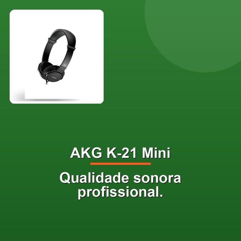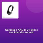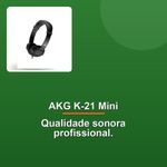 Akg Fone K-21 Mini HeadphoneDesperte a sua experiência auditiva com o AKG K-21 Mini Headphones, o fone de ouvido profissional que combina qualidade de som excepcional com praticidade e design moderno. Ideal para um novo público que busca a mesma excelência sonora AKG em suas plataformas de streaming e trabalho, o K-21 Mini se destaca por seus transdutores de 40 mm que entregam uma resposta de frequência equilibrada, revelando cada detalhe da música com naturalidade.Desfrute da imersão sonora perfeita com o seu design fechado e ear cups autoajustáveis que oferecem isolamento contra ruídos, proporcionando um encaixe confortável e personalizado. Com baixa impedância, o K-21 Mini é compatível com uma ampla gama de dispositivos de reprodução, desde seus smartphones e tablets até consoles e equipamentos profissionais, garantindo versatilidade para todas as suas necessidades.Peso leve e construção moderna, o AKG K-21 Mini se torna o seu companheiro ideal para a vida dinâmica, sejam paisagens sonoras durante seu trajeto ou sessões produtivas em home office e reuniões online. Experimente a qualidade AKG em cada nota, com um fone de ouvido que traduz profissionalidade em todo ambiente.Desperte a sua experiência auditiva com o AKG K-21 Mini Headphones, o fone de ouvido profissional que combina qualidade de som excepcional com praticidade e design moderno. Ideal para um novo público que busca a mesma excelência sonora AKG em suas plataformas de streaming e trabalho, o K-21 Mini se destaca por seus transdutores de 40 mm que entregam uma resposta de frequência equilibrada, revelando cada detalhe da música com naturalidade.Desfrute da imersão sonora perfeita com o seu design fechado e ear cups autoajustáveis que oferecem isolamento contra ruídos, proporcionando um encaixe confortável e personalizado. Com baixa impedância, o K-21 Mini é compatível com uma ampla gama de dispositivos de reprodução, desde seus smartphones e tablets até consoles e equipamentos profissionais, garantindo versatilidade para todas as suas necessidades.Peso leve e construção moderna, o AKG K-21 Mini se torna o seu companheiro ideal para a vida dinâmica, sejam paisagens sonoras durante seu trajeto ou sessões produtivas em home office e reuniões online. Experimente a qualidade AKG em cada nota, com um fone de ouvido que traduz profissionalidade em todo ambiente.