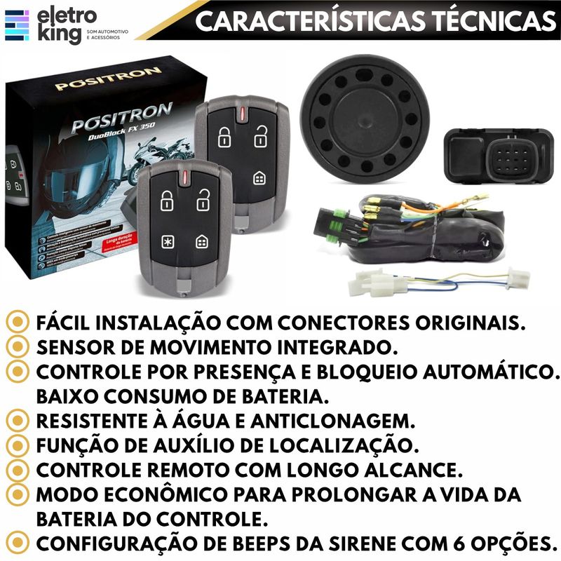 Alarme P/ Moto Positron Duoblock FX 350 G8 Dedicado Bros 160 2024 Em Diante Proteja sua moto com o alarme dedicado que une tecnologia, praticidade e segurança! Fácil de instalar, com conectores originais, sensor de movimento inteligente, controle por presença e bloqueio automático. Tudo isso com baixo consumo de bateria, resistência à água e proteção contra interferências. Mais tranquilidade e segurança em cada parada! Especificações Técnicas: • COMPATIBILIDADE: Moto Bros 160 2024 em diante. Chicote dedicado com conectores originais, sem necessidade de cortes de fios. • CONSUMO DE BATERIA: Baixo consumo, projetado para não interferir no funcionamento da motocicleta. Compatível com 99% das motocicletas atuais, incluindo modelos com tecnologia LED. • SENSOR DE MOVIMENTO INTEGRADO: Disparo automático da sirene ao detectar movimentação da motocicleta em qualquer direção. Funciona com ignição desligada e alarme ativado. Exclusividade Pósitron. • CONTROLE POR PRESENÇA: Acionamento automático do alarme ao afastar o controle da motocicleta. Sirene dispara, setas piscam e motor de partida é bloqueado. Tempo de disparo programável. • FUNÇÃO AUXÍLIO DE LOCALIZAÇÃO: Acionamento das setas por 30 segundos ao pressionar o botão “Auxiliar” no controle remoto. • CHAVE MASTER NO MÓDULO: Permite programação rápida e simplificada das funções do alarme. • INSTALAÇÃO SEGURA E INTELIGENTE: Software e hardware compatíveis com motocicletas com painel eletrônico. Não interfere no sistema elétrico da motocicleta. • FACILIDADE DE OPERAÇÃO: Ativação manual pelo botão “Liga” do controle ou automática ao se afastar com o controle. Senha secreta para habilitação ou desativação na ignição em caso de perda do controle. • CONTROLES REMOTOS: Longo alcance, conforme normas da Anatel. Configuração de beeps da sirene com até 6 opções diferentes. Gravação de até 4 controles remotos. Sensor de movimento no controle: entra automaticamente em modo “Econômico” após 25 minutos de inatividade, prolongando a vida útil da bateria. Reativação automática ao movimentar o controle. • RESISTÊNCIA: Módulo, controles remotos e sirene selados e resistentes à água. • TECNOLOGIA ASIC: Módulo mais resistente a interferências eletromagnéticas. Evita disparos falsos. Conteúdo da Embalagem: • 02 Controles • 01 Módulo Central de Alarme • 01 Sirene • 01 Chicote • 01 Manual de instalação Importante: • Garantia de 273 Dias • Valor da Unidade.