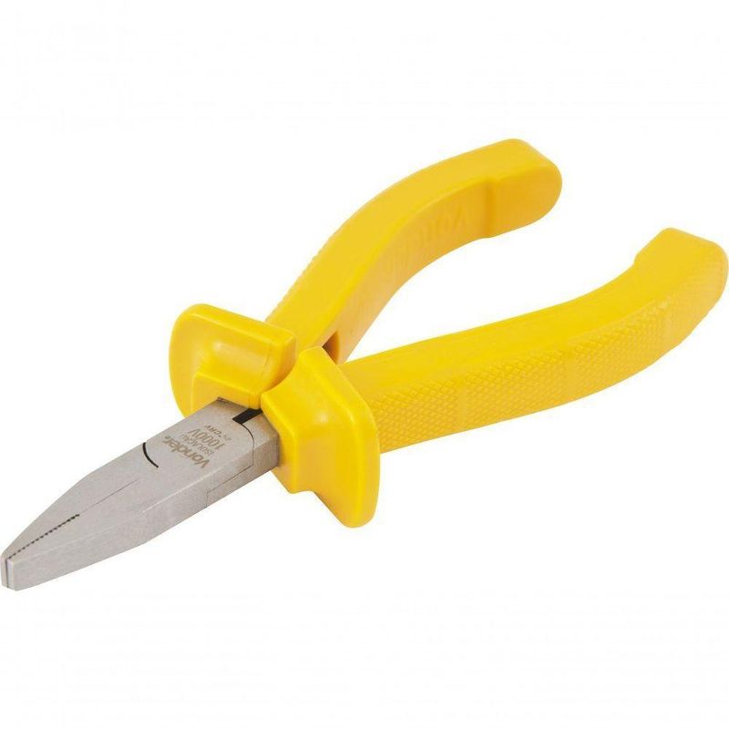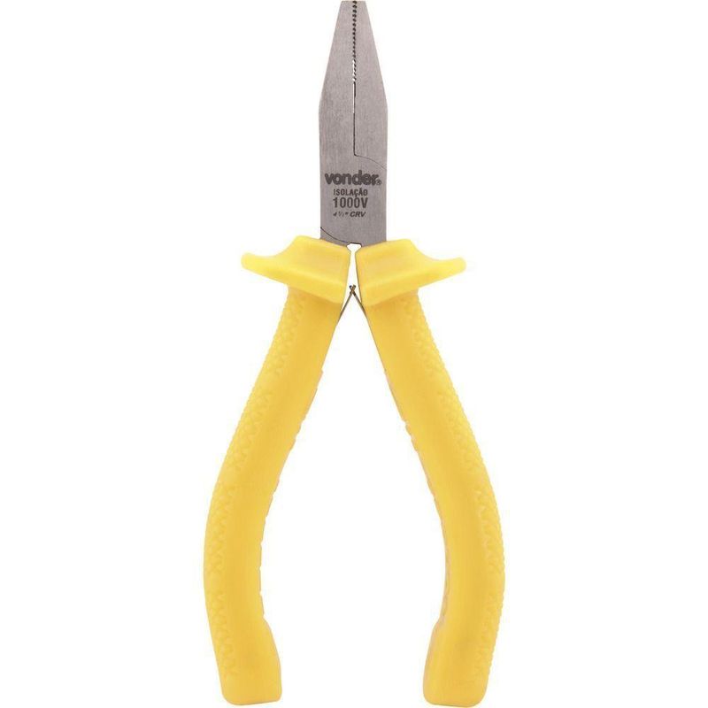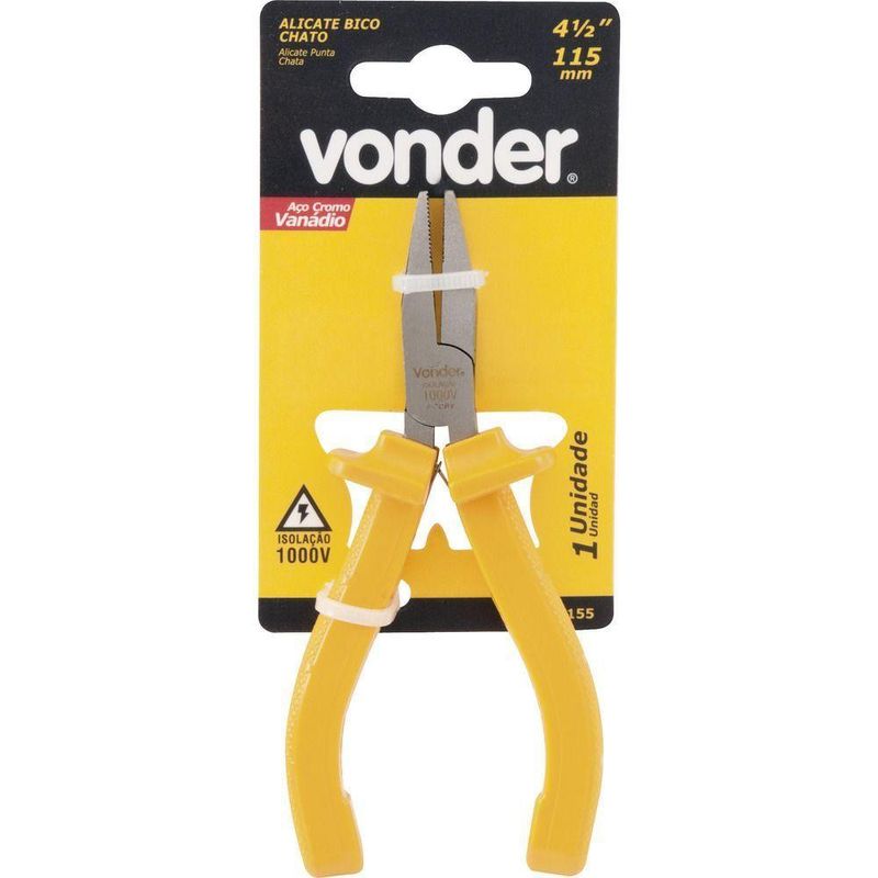 Alicate Bico Chato 4.1/2 Cromo Vanádio Isolado 1000v VonderConteúdo da embalagem1 Alicate bico chatoAplicações e dicas de usoIndicado para manuseio de terminais elétricos e peças planasDestaques e diferenciaisPossui cabo antiderrapante (ranhurado) com abas de proteção, proporcionando melhor manuseio, além de abertura controlada por lâminas de efeito mola, conferindo menor esforço ao operadorDETALHES TÉCNICOSMaterial do corpo do alicate:Aço cromo vanádioAcabamento do alicate:PolidoComprimento total do alicate:4.1/2 - 114 mmTipo do cabo do alicate.:Cabo isolado 1000 V Produto: Alicate
