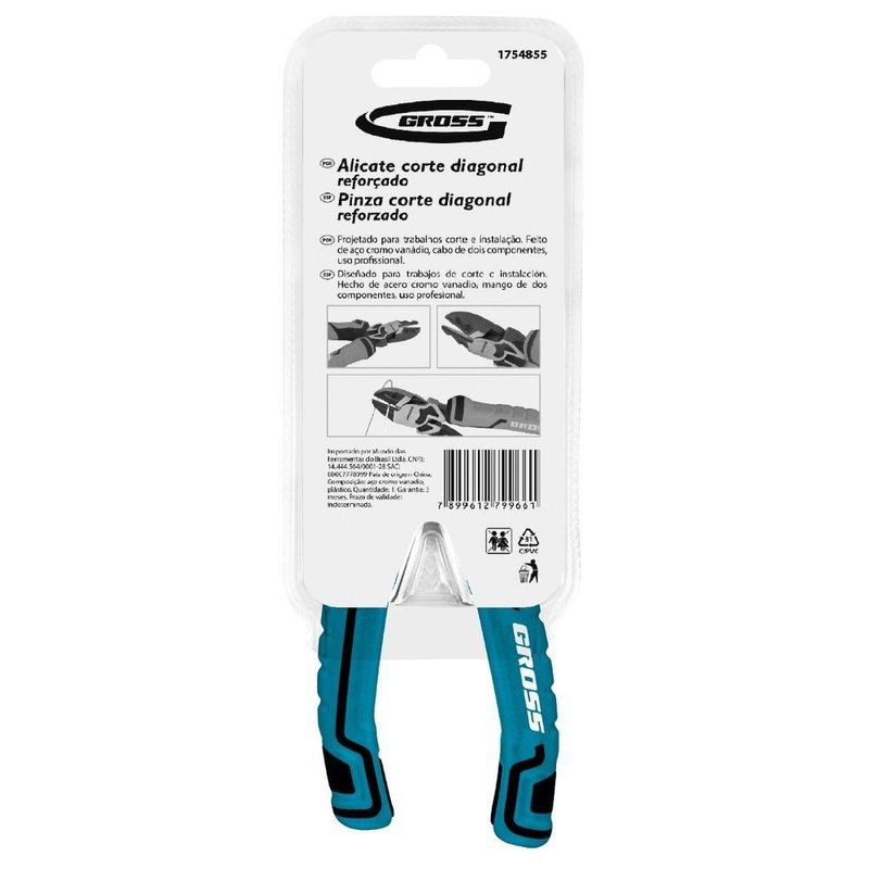 Alicate Corte Diagonal 6'' 150mm Gross 1754855 Aço CrvAlicate Corte Diagonal Reforçado Fosfatizado 6pol - 150mmO Alicate Corte Diagonal Gross 1754855, com seu comprimento de 150 mm e sistema reforçado, é uma ferramenta indispensável para uma vasta gama de aplicações, desde trabalhos de montagem e mecânica até tarefas domésticas. Projetado para cortar fios, cabos, arames e até estruturas metálicas e plásticas, este alicate combina robustez com precisão, tornando o corte de peças e parafusos mais espessos uma tarefa simples. Fabricado em aço cromo-vanádio por forjamento, oferece alta resistência (56-62 HRC), assegurando uma longa vida útil mesmo sob uso intenso. Seu design estratégico, com dobradiça próxima às bordas de corte e sistema High leverage, proporciona uma transferência de força superior, aumentando a produtividade e exigindo menos esforço. A dimensão compacta facilita o trabalho em espaços limitados, enquanto as alças de dois componentes com revestimento antiderrapante garantem um manuseio confortável e seguro. Ideal para profissionais e entusiastas do DIY que buscam precisão, durabilidade e conforto em suas tarefas de corte. Especificações Material da parte de trabalho: Aço CrV País de fabricação: China Itens Inclusos Alicate Corte Diagonal Reforçado Fosfatizado 6pol - 150mm Perguntas Frequentes (FAQ) Pergunta: Qual a dureza do aço utilizado na fabricação do alicate?Resposta: O alicate é fabricado em aço cromo-vanádio por forjamento, com uma dureza entre 56 e 62 HRC. Pergunta: O alicate é adequado para cortar cabos grossos?Resposta: Sim, o alicate é projetado para cortar fios, cabos, arames e até estruturas metálicas e plásticas mais espessas. Pergunta: Qual a garantia do produto?Resposta: Garantia legal: 90 dias. Produto: Alicate | Tipo de Produto: Alicate