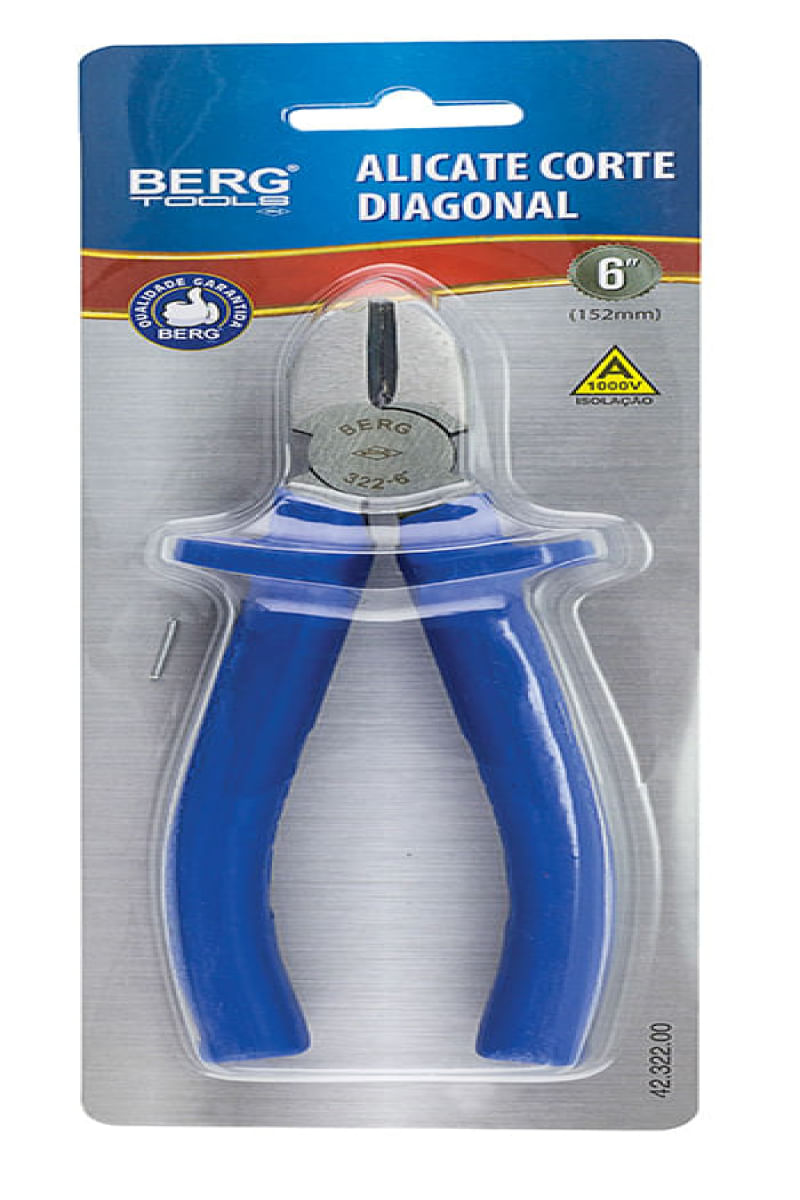 ALICATE CORTE DIAGONAL 6 BERG - Dimensões da Peça: 15,4 x 5,7 x 2,9cm - Dimensões da Embalagem: 8 x 2,5 x 23cm - Quantidade da Inter: 6 Peças - Dimensões da Inter: 24 x 19 x 9cm - Quantidade Master: 60 Peças - Dimensões Master: 45 x 26 x 40cm - Material: Aço carbono e PVC - Cor do cabo: Azul - Tipo de Embalagem: Blister - Marca: Berg Tools - Origem: China - Contém: 1 Unidade - Fabricado na China sob supervisão técnica Corneta Ferramentas do Brasil. - Aplicação: - Cortar arames e fios. - Características: - Forjado em aço carbono. - Tempera total no alicate. - Temperatura por indução na região do corte. - Cabos em PVC. - Isolação 1000 V c a.material e fabricação, mediante apresentação da nota fiscal de compra. Má conservação, manuseio inadequado, quedas ou quaisqueGarantia do produto: 90 dias de garantia de acordo com o Código de Defesa do Consumidor + a Garantia do Fabricante