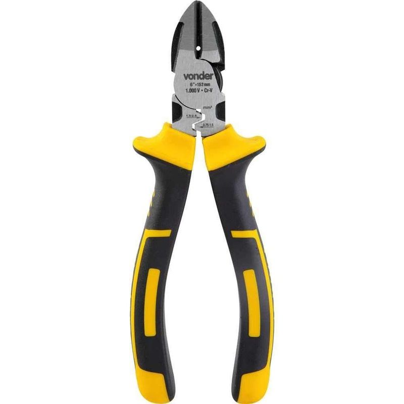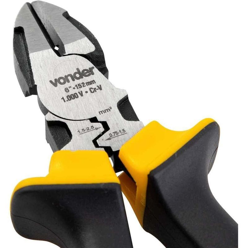 Alicate Corte Diagonal 6, Para Eletricista, Com Isolação Até 1.000 V, Vonder OstenvonderAlicate Corte Diagonal 6, Para Eletricista, com Isolação até 1.000 V, Vonder OstenVonder -Conteúdo da embalagem: 1 Alicate corte diagonal.Aplicação: Indicado para cortar e desencapar fios e cabos elétricos, além de arames macios. Capacidade de corte: 1,6 mm.Destaques: Confeccionado em aço cromo vanádio, proporcionando maior durabilidade. Possui cabo isolado para tensão de até 1.000 V e função para crimpagem.Garantia - E (CDC): Garantia legal: 90 diasReferência: 3662061520Material do corpo do alicate: Aço cromo vanádioAcabamento: Escurecido com faces polidasMassa aproximada (peso): 0.3 kgTipo do cabo do alicate.: Cabo em borracha termoplástica (TPE), isolado 1.000 VComprimento total: 6 (152 mm)Destaques Comercial: Feito em aço cromo vanádio, com cabo isolado até 1.000 V e função de crimpagem.Aplicação Comercial: Usado para cortar e desencapar fios e cabos elétricos e arames macios; corte até 1,6 mm.Características Gerais do Produto:Garantia: - 3 Meses