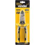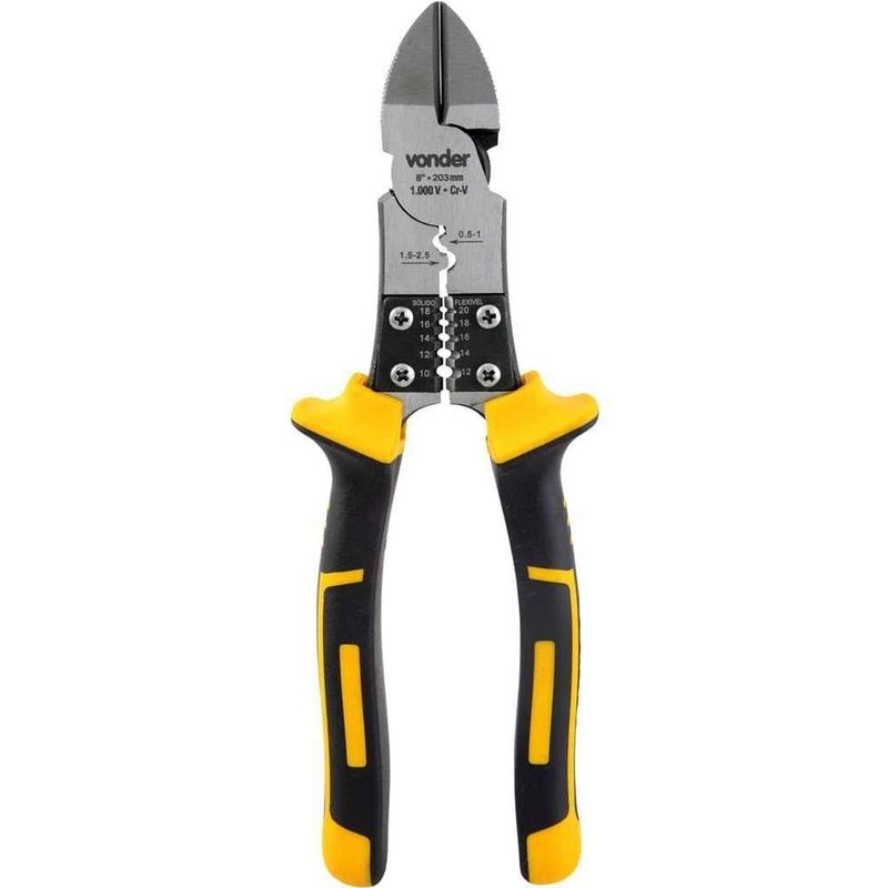 Alicate Corte Diagonal 8, Para Eletricista, Multifunção, Com Isolação Até 1.000 V, Vonder OstenvonderAlicate Corte Diagonal 8, Para Eletricista, Multifunção, com Isolação até 1.000 V, Vonder OstenVonder -Conteúdo da embalagem: 1 Alicate corte diagonal.Aplicação: Indicado para cortar e desencapar fios e cabos elétricos, além de arames. Capacidade de corte: 2,0 mm.Destaques: Confeccionado em aço cromo vanádio, proporcionando maior durabilidade. Possui cabo isolado para tensão de até 1.000 V, função para crimpar e desencapar fios de 0,5 mm² a 5,0 mm².Garantia - E (CDC): Garantia legal: 90 diasReferência: 3662008203Material do corpo do alicate: Aço cromo vanádioComprimento total: 8'' - 203,2 mmAcabamento: Escurecido com faces polidasMassa aproximada (peso): 0.3 kgTipo do cabo do alicate.: Cabo em borracha termoplástica (TPE), isolado 1.000 VDestaques Comercial: Feito em aço cromo vanádio, com cabo isolado 1.000 V e função para crimpar e desencapar fios de 0,5 a 5,0 mm².Aplicação Comercial: Usado para cortar e desencapar fios, cabos elétricos e arames. Capacidade de corte: 2,0 mm.Características Gerais do Produto:Garantia: - 3 Meses