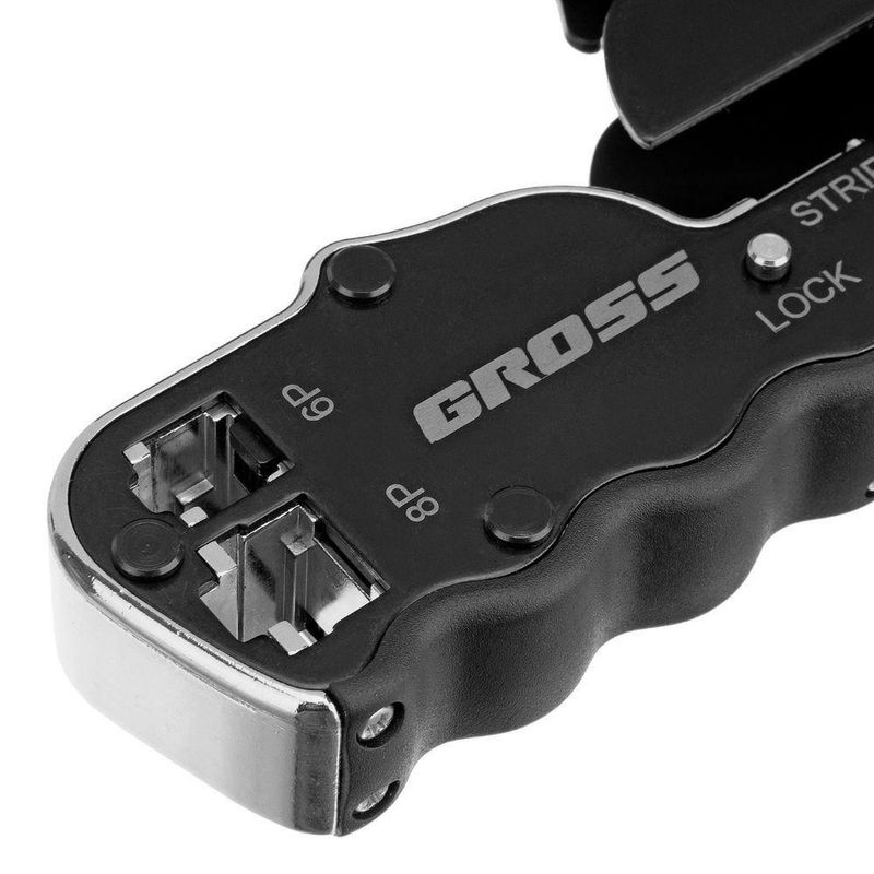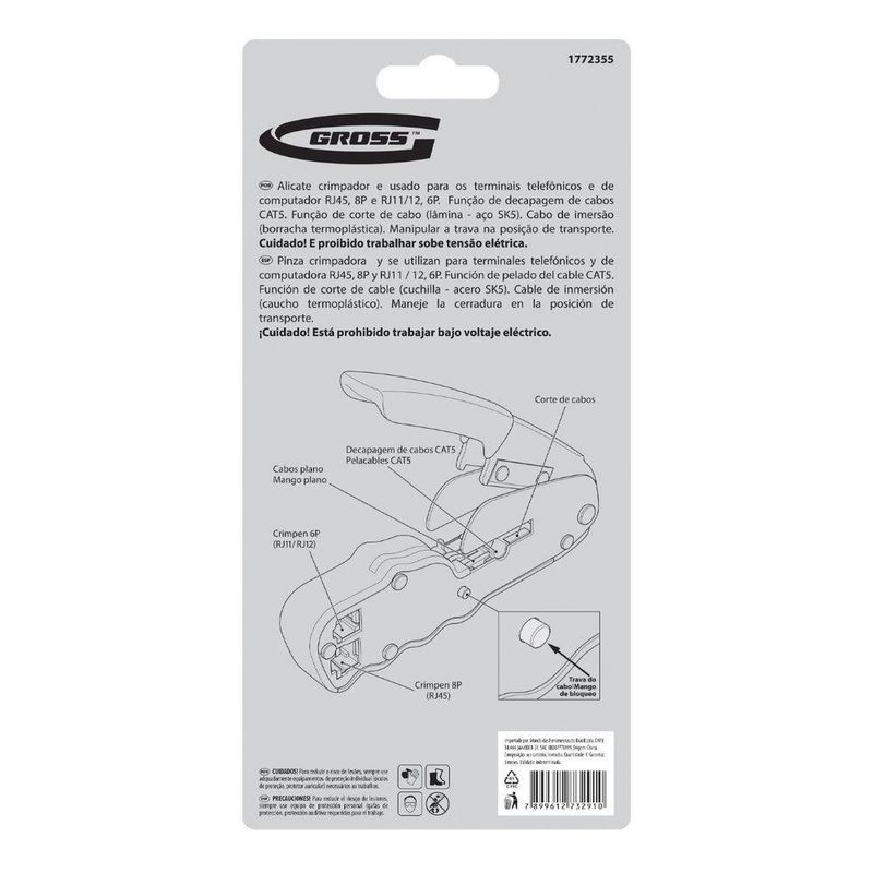 Alicate Crimpador Rj11/12 Rj45 Emborrachado GrossCrimpador de Cabos RJ11/12 e RJ45: Conexões Perfeitas e DuráveisGaranta conexões de rede e telefonia impecáveis com o Alicate Crimpador Compacto Gross 1772355. Projetado para profissionais e entusiastas, este alicate combina as funções de crimpagem, decapagem e corte em uma única ferramenta robusta e ergonômica. Ideal para trabalhar com os conectores RJ45 (8P) e RJ11/12 (6P) mais utilizados, além de cabos CAT5, ele simplifica a instalação e manutenção de redes de computadores e sistemas telefônicos. Fabricado em Taiwan com aço japonês SK5 de alta qualidade, este alicate oferece durabilidade excepcional e crimpagens precisas, resistindo ao uso intensivo. A alça emborrachada proporciona conforto e segurança, reduzindo a fadiga durante longos períodos de trabalho. O fixador integrado mantém a alça fechada para armazenamento e transporte seguros, protegendo as lâminas e evitando acidentes. Invista em uma ferramenta que otimiza seu trabalho e garante resultados profissionais em cada conexão. Especificações Material da lâmina: Aço japonês SK5 Tipo de conector: RJ45 (8P), RJ11/12 (6P) Funções: Crimpagem, decapagem, corte Itens Inclusos Alicate Crimpador Compacto Gross 1772355 Perguntas Frequentes (FAQ) Pergunta: Este alicate serve para quais tipos de cabo?Resposta: Serve para crimpar terminais telefônicos e de computador RJ45 (8P) e RJ11/12 (6P), além de decapar cabos CAT5. Pergunta: O alicate é resistente?Resposta: Sim, as lâminas são fabricadas em aço japonês SK5 de alta qualidade, garantindo resistência e longa vida útil. Pergunta: O alicate é confortável de usar?Resposta: Sim, possui alça emborrachada para um manuseio seguro e confortável, reduzindo a fadiga. Pergunta: Qual a garantia do produto?Resposta: Garantia legal: 90 dias Produto: Alicate | Tipo de Produto: Alicate