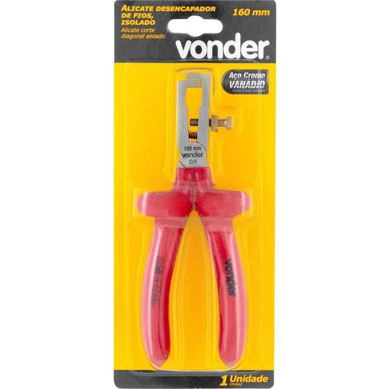 Alicate Desencapador 6'', Para Fios, Iec, Com Isolação Até 1.000 V, Vonder OstenvonderAlicate Desencapador 6'', Para Fios, Iec, com Isolação até 1.000 V, Vonder OstenVonder -Conteúdo da embalagem: 1 Alicate desencapador de fios.Aplicação: Indicado para desencapar fios. Utilizado em eletrônica, telefonia e setor automotivo.Destaques: Atende a norma internacional EN/IEC 60900:2004. Possui cabo isolado para 1.000 V, testado individualmente, com abas de proteção que oferecem melhor manuseio.Garantia - E (CDC): Garantia legal: 90 diasReferência: 3626601609Material do corpo do alicate: Aço cromo vanádioComprimento total: 160,0 mmCapacidade do alicate desencapador: 0,5 mm² a 10,0 mm²Acabamento: PolidoMassa aproximada (peso): 0.2 kgIsolação: 1.000 VDestaques Comercial: Atende à norma EN/IEC 60900:2004. Cabo isolado para 1.000 V, testado e com abas de proteção.Aplicação Comercial: Indicado para desencapar fios em eletrônica, telefonia e setor automotivo.Características Gerais do Produto:Garantia: - 3 Meses