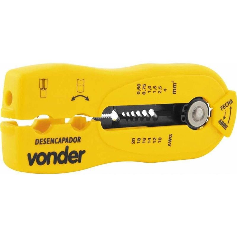 Alicate Desencapador Fixo, Para Fios E Cabos, VonderAlicate Desencapador Fixo, Para Fios e Cabos, Vonder -Conteúdo da embalagem: 1 Alicate desencapador de fios. Acompanha: 1 lâmina extra.Aplicação: Indicado para desencapar cabos par trançado UTP e STP, cabos coaxiais, cabos de áudio e cabos de rede.Destaques: Material do corpo em plástico ABS, na cor amarela.Referência: 3662122000Garantia - E (CDC): Garantia legal: 90 diasMassa aproximada (peso): 0,12 kgMaterial do corpo do alicate: Plástico ABSCapacidade do alicate desencapador: 0,5 mm² a 4 mm²Destaques Comercial: Material do corpo em plástico ABS, na cor amarela.Aplicação Comercial: Indicado para desencapar cabos par trançado UTP e STP, cabos coaxiais, cabos de áudio e cabos de rede.Características Gerais do Produto:Garantia: - 3 Meses