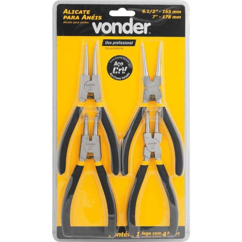 Alicate Para Anéis, Jogo Com 4 Peças, 6 1/2 - 165 Mm E 7 - 178 Mm, Vonder OstenvonderAlicate Para Anéis, Jogo com 4 Peças, 6 1/2 - 165 mm e 7 - 178 mm, Vonder OstenVonder -Conteúdo da embalagem: Contém 1 jogo com 4 peças, sendo: 1 alicate para anéis internos, reto, 7 - 178 mm, diâmetro de aplicação: 18 mm a 63 mm; 1 alicate para anéis internos, curvo, 6.1/2 - 165 mm, diâmetro de aplicação: 18 mm a 63 mm; 1 alicate para anéis externos, reto, 7 - 178 mm, diâmetro de aplicação: 18 mm 63 mm; 1 alicate para anéis externos, curvo, 6.1/2 - 165 mm, diâmetro de aplicação: 18 mm a 63 mm.Aplicação: Indicado para uso profissional na remoção e colocação de anéis internos e externos de retenção.Destaques: Produzido em aço cromo vanádio, proporcionando maior resistência e durabilidade.Referência: 3662004007Garantia - E (CDC): Garantia legal: 90 diasMassa aproximada (peso): 0,75 kgTipo do cabo do alicate.: Cabo plastificadoMaterial do corpo do alicate: Aço cromo vanádioAcabamento: NiqueladoTamanho: 6.1/2Destaques Comercial: Produzido em aço cromo vanádio, proporcionando maior resistência e durabilidade.Aplicação Comercial: Indicado para uso profissional na remoção e colocação de anéis internos e externos de retenção.Características Gerais do Produto:Garantia: - 3 Meses