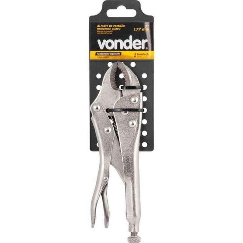 Alicate Pressão 7 Curvo - VonderMarca:VonderConteúdo da Embalagem:1 Alicate de pressãoDescrição:Alicate de pressão 7 mordente curvo VONDERIndicações:Indicado para segurar, fixar, prender, travar, apertar e soltar diversos perfis de materiais.Características Técnicas:Categoria do multímetro: CAT III 600V Acabamento do alicate: Niquelado Comprimento total do alicate: 7'' - 177 mmCodigo do Forncedor:3662100007 Produto: Alicate