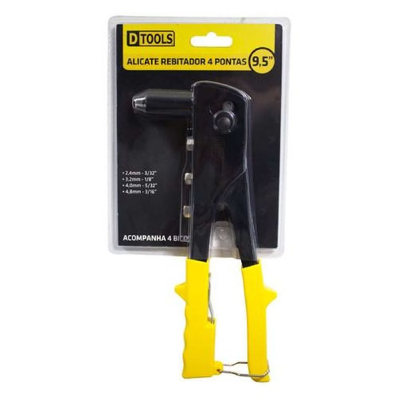Alicate Rebitador 9,5'' com 4 Pontas e 4 Bicos - Compatível com Rebites de 2,4 a 4,8mm - ALICATE REBITADOR 4 PONTAS 9,5'' - DTOOLSO Alicate Rebitador 4 Pontas 9,5'' da DTOOLS é a ferramenta ideal para quem busca praticidade e eficiência na hora de realizar trabalhos de fixação com rebites. CompatÃvel para rebites de 2,4 a 4,8mm, este alicate é indispensável para profissionais que trabalham com montagem de estruturas metálicas, reparos automotivos, marcenaria e muito mais.O alicate acompanha 4 bicos, proporcionando versatilidade para diferentes tipos de trabalho. Seu cabo emborrachado garante maior conforto e segurança durante o uso, evitando escorregões e proporcionando maior precisão.* CompatÃvel com rebites de 2,4 a 4,8mm* Acompanha 4 bicos para maior versatilidade* Cabo emborrachado para maior conforto e segurança* Ideal para montagem de estruturas metálicas, reparos automotivos, marcenaria, entre outrosElevando a qualidade e a praticidade em seus projetos, o Alicate Rebitador 4 Pontas 9,5'' - DTOOLS Universo do Lar é a escolha certa para quem busca eficiência e durabilidade em suas ferramentas.Informações Técnicas: - Marca: DTOOLS - Modelo: Alicate Rebitador 4 Pontas 9,5'' - Compatibilidade: Rebites de 2,4 a 4,8mm - Material: Metal e borracha - Comprimento: 9,5 polegadasGarantia de qualidade e durabilidade da marca DTOOLS Universo do Lar. -------- Descrição Original enviada pelo Fornecedor: ALICATE REBITADOR 4 PONTAS 9,5'' - DTOOLSCompatÃvel para rebites de 2,4 a 4,8mmAcompanha 4 bicosCabo emborrachado Características Gerais do Produto: Garantia: • 3 meses