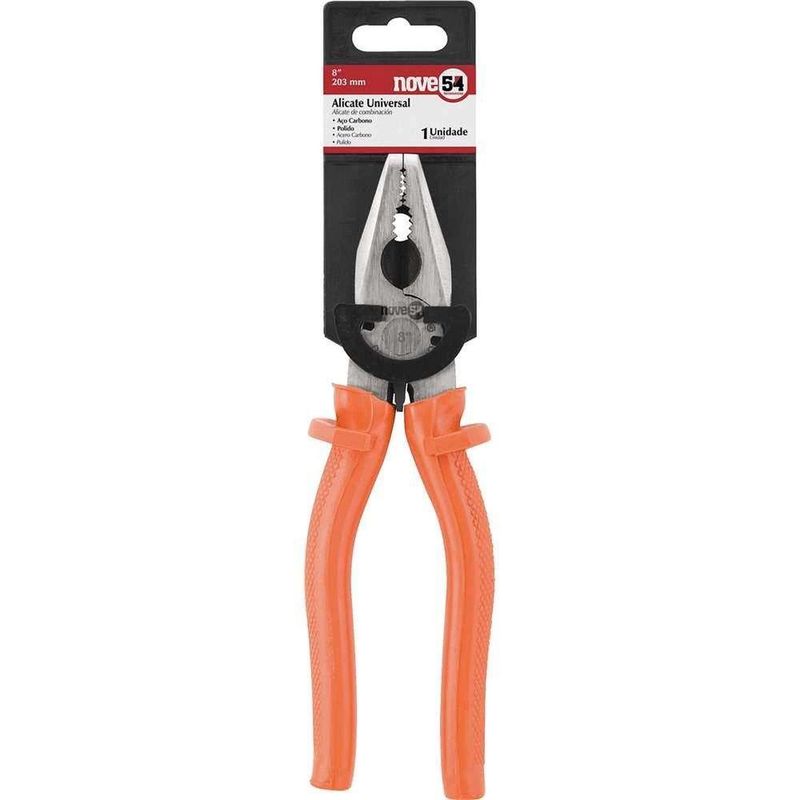 Alicate Universal 8, Aço Carbono, Heavy Duty, Nove54 OstenvonderAlicate Universal 8, aço Carbono, Heavy Duty, Nove54 OstenVonder -Conteúdo da embalagem: 1 Alicate universal.Aplicação: Indicado para segurar peças planas e cilíndricas, cortar e desencapar fios (não energizados).Destaques: Possui cabo anatômico e abas de proteção que oferecem maior conforto e segurança.Referência: 3662830000Garantia - E (CDC): Garantia legal: 90 diasMassa aproximada (peso): 0.371 kgTipo do cabo do alicate.: Sem isolaçãoMaterial do corpo do alicate: Aço carbonoComprimento total: 8'' - 203 mmAcabamento: PolidoDestaques Comercial: Possui cabo anatômico e abas de proteção que oferecem maior conforto e segurança.Aplicação Comercial: Indicado para segurar peças planas e cilíndricas, cortar e desencapar fios (não energizados).Características Gerais do Produto:Garantia: - 3 Meses