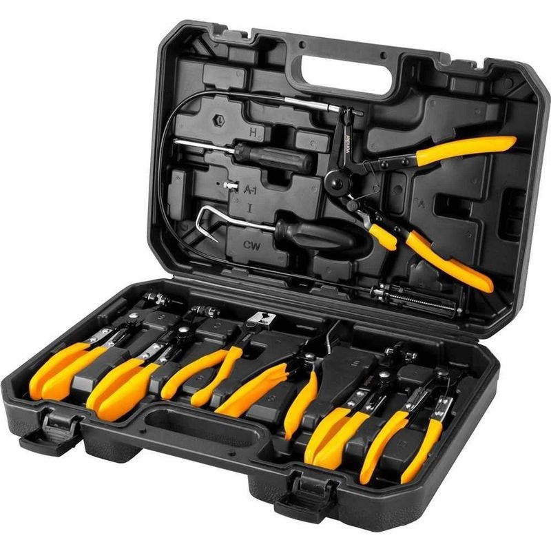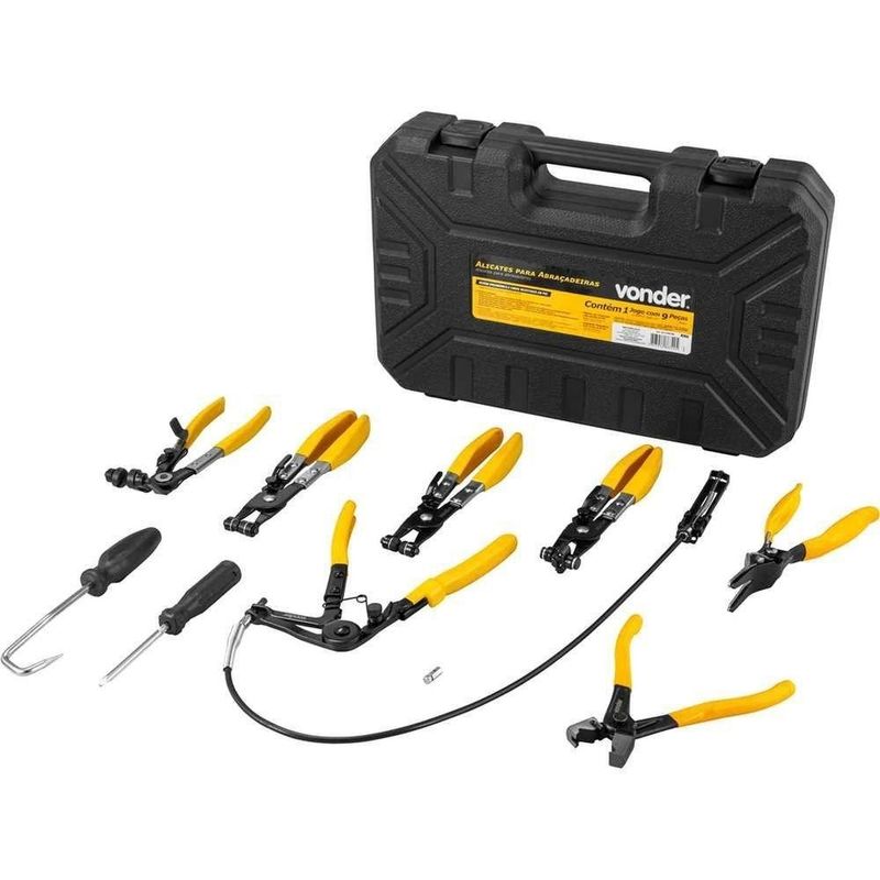 Alicates Para Abraçadeiras, Jogo Com 9 Peças, Vonder OstenvonderAlicates Para Abraçadeiras, Jogo com 9 Peças, Vonder OstenVonder -Conteúdo da embalagem: 1 Conjunto de alicates para abraçadeiras com 9 peças. Acompanha: 1 maleta plástica, 1 alicate para abraçadeira elástica com mordente fixo e chato (plano), 1 alicate para abraçadeira elástica com ponta em ângulo de 45°, 1 alicate flexível para abraçadeira elástica, 1 alicate para abraçadeira de mangueira com mordente em ângulo, 1 alicate para abraçadeira elástica perfil chato (plano), 1 alicate para abraçadeira tipo clic-r, 1 alicate para desconectar mangueira de combustível, 1 chave manual com ponta angular para remoção de mangueiras e 1 chave manual com ponta phillips e fenda.Aplicação: Indicado para a abertura de vários tipos de abraçadeiras em mangueiras de combustível, óleo, água, ar condicionado, entre outros.Destaques: Possui sistema de trava que mantém a abraçadeira elástica aberta facilitando sua colocação. Seu design ergonômico e cabo revestido em PVC garantem um manuseio confortável, diminuindo a fadiga durante o uso. Conta com um alicate flexível com pontas que permite o acesso a abraçadeiras localizadas em áreas de difícil acesso. Isto não só facilita o trabalho em espaços apertados, mas também reduz o tempo gasto em tarefas complicadas. Além de possuir uma chave com duas ponteiras (phillips e fenda) e uma maleta plástica para armazenagem e transporte.Garantia - E (CDC): Garantia legal: 90 diasReferência: 6510009009Material: Aço carbono com cabo revestido em PVCCapacidade: Abraçadeiras de Ø 19 mm a Ø 55 mmMassa aproximada (peso): 3 kgDestaques Comercial: Ferramenta com trava que mantém a abraçadeira aberta, alicate flexível para locais de difícil acesso, chave dupla e maleta para transporte.Aplicação Comercial: Indicado para abrir abraçadeiras em mangueiras de combustível, óleo, água e ar condicionado.Características Gerais do Produto:Garantia: - 3 Meses