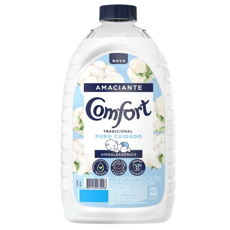 Amaciante Comfort Puro Cuidado Roupas Finas de Bebês Exclusivo Edição Limitada 3 LitrosAmaciante Comfort Puro CuidadoO Amaciante Comfort Puro Cuidado é uma edição limitada exclusiva desenvolvida especialmente para roupas finas e delicadas, com foco especial em peças de bebês. Com um aroma suave e duradouro, este amaciante é a escolha ideal para quem deseja tratar as roupas com o máximo de carinho e cuidado.Características do ProdutoRoupas Finas e Delicadas: Especialmente formulado para garantir a maciez sem danificar as fibras das roupas mais delicadas.Roupas de Bebês: Ideal para as roupas dos pequenos, oferecendo um cuidado extra suave e seguro.Cheirinho de Bebê: Aroma suave e reconfortante que remete à sensação de aconchego e carinho.Cheirinho Duradouro: Proporciona frescor de longa duração, mantendo as roupas perfumadas por mais tempo.Galão de 3 Litros: Embalagem econômica que garante um ótimo custo-benefício, ideal para famílias que buscam praticidade e eficiência no cuidado com as roupas.