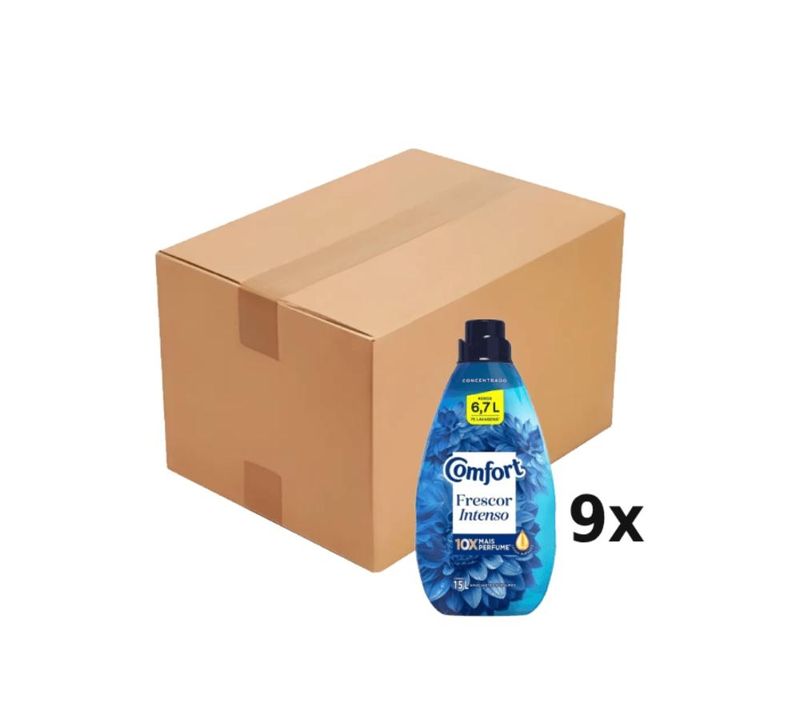 Amaciante Concentrado Comfort Frescor Intenso 1,5 L Caixa com 9 Unidades O amaciante de roupas Comfort tem 10x mais perfume de longa duração, que deixa suas roupas perfumadas por muito mais tempo • O Amaciante Concentrado Comfort Frescor Intenso tem ótimo rendimento, menos de meia tampinha basta na sua lavagem*! Rende 6,7 Litros e 75 lavagens*• O Amaciante Concentrado Comfort Frescor Intenso possui óleo de argan*****, que cuida intensamente das suas roupas enquanto as perfuma por muito tempo• Esse amaciante de roupa possui cápsulas de perfume para roupas que blindam contra o mau odor**** e perfumam sua lavanderia• Comfort previne suas peças dos danos da lavagem de roupa, mantendo as cores*** dos tecidos vibrantes e evitando a formação de bolinhas*** e esgarçamento***