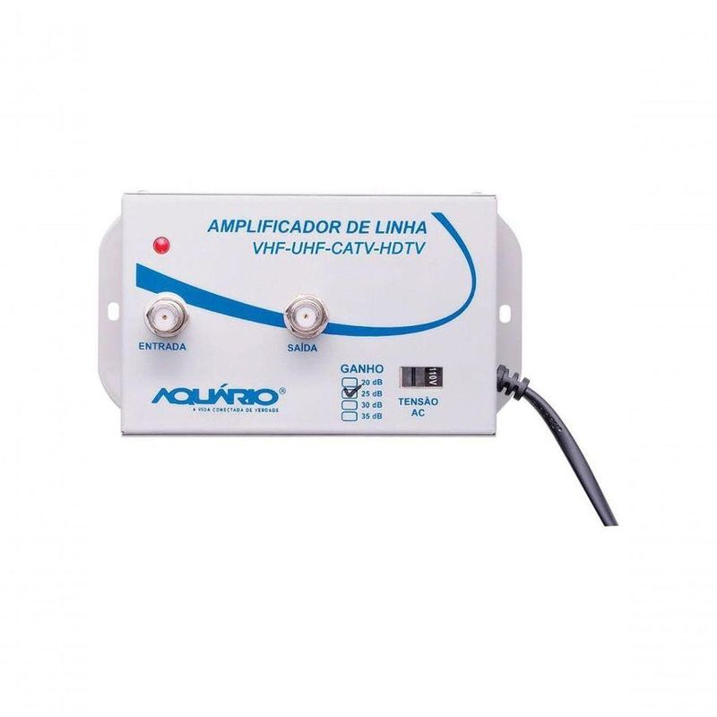 Amplificador De Linha Para Tv Aquario Al-25 25db BivoltInformações do ProdutoAmplificador de linha para TV 25DB AL-25 BivoltAmplificador de linha com ganho de 25db na sua instalação!Melhor solução para dividir o sinal VHF/UHF/CATV/HDTV e compensar perdas em instalações sejam elas domésticas ou prediais. Recomendado e aprovado por instaladores em todo o Brasil. O melhor custo X benefício- Ganho de 25dB na instalação - Amplifica e estabiliza sinais VHF/UHF/CATV/HDTV - Baixo consumo de energia - Case de metal com pintura eletrostática para proteção do equipamento - Fonte bivolt integrada com seletor manual 110/220Informações TécnicasSensibilidade rx -85 dbmFrequência 54 ~ 806 mhzImpedância 75 ohmsGanho 25dbLeds power on power offCase metálicoConector f fêmeaInstalação internaMaterial metalPeso 0,310 kgDimensões Cm 10(L)x15(A)x6(P)Garantia 1 ano da fábricaInformações do ProdutoAmplificador de linha para TV 25DB AL-25 BivoltAmplificador de linha com ganho de 25db na sua instalação! Melhor solução para dividir o sinal VHF/UHF/CATV/HDTV e compensar perdas em instalações sejam elas domésticas ou prediais. Recomendado e aprovado por instaladores em todo o Brasil. O melhor custo X benefício- Ganho de 25dB na instalação - Amplifica e estabiliza sinais VHF/UHF/CATV/HDTV - Baixo consumo de energia - Case de metal com pintura eletrostática para proteção do equipamento - Fonte bivolt integrada com seletor manual 110/220Informações TécnicasSensibilidade rx -85 dbmFrequência 54 ~ 806 mhzImpedância 75 ohmsGanho 25dbLeds power on power offCase metálicoConector f fêmeaInstalação internaMaterial metalPeso 0,310 kgDimensões Cm 10(L)x15(A)x6(P)Garantia 1 ano da fábrica