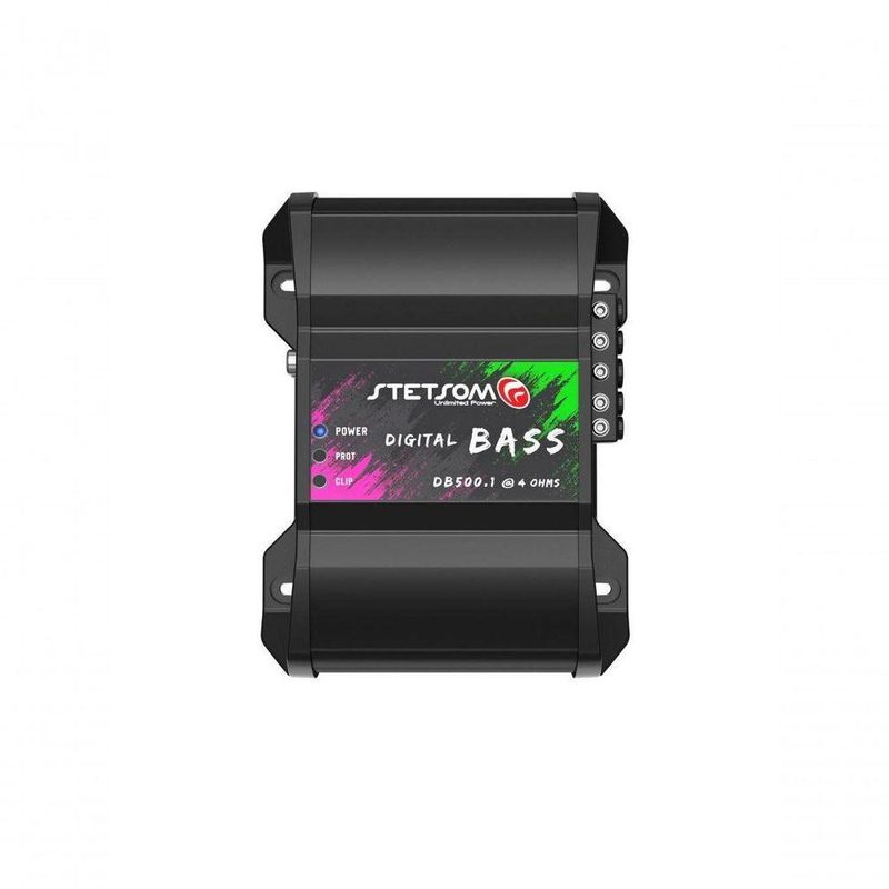 Amplificador Digital Stetsom Db500 500w 1 Canal 4 OhmsO amplificador DB500 foi desenvolvido com a mais avançada tecnologia para quem busca alto desempenho em baixas frequências com sistemas de áudio com um ou mais subwoofers/woofers. CONEXÃO DE ENTRADA HIGH INPUT: Utilize a conexão quando o rádio/player não possuir saídas RCA. O conector possui sinal estéreo (L e R) identificados no produto. Verifique os sinais da saída amplificada do rádio/player antes de realizar as ligações. Para acionamento remoto do amplificador, utilize a conexão REMOTE IN ou REM. CONEXÃO DE ENTRADA RCA: Conexão RCA dupla com entrada estéreo (L+R) identificada no produto. Faça a conexão com as saídas do rádio/player através de cabos RCA blindados de qualidade para evitar ruídos indesejados. *Imagens meramente ilustrativas. Número de Canais: 1 Potência RMS: 500W Potência RMS em 4 Ohms 12,6V: 420W Potência RMS em 8 Ohms 12,6V: 240W Potência RMS em 4 Ohms 13,8V: 500W Potência RMS em 8 Ohms 13,8V: 290W Potência RMS em 4 Ohms 14,4V: 550W Potência RMS em 8 Ohms 14,4V: 320W Tensão de Alimentação: 9V ~15.5V DC Resposta em Frequência: 5Hz ~250Hz Crossover Low Pass: 35Hz ~250Hz Crossover High Pass: 5Hz ~35Hz (Subsonic) Relação Sinal Ruído:>90dB Sensibilidade de Entrada RCA: 200mV / HIGH INPUT: 1.5V Impedância de Entrada RCA: 15K Ohms / HIGH INPUT: 1K Ohms Impedância Mínima de Saída: 4 OHMS Consumo com Sinal Musical: 20A Consumo com Sinal Bass: 40A Dimensões (A x L x C) mm: 55 x 162 x 125.5 mm Peso Kg: 0.75 KgO amplificador DB500 foi desenvolvido com a mais avançada tecnologia para quem busca alto desempenho em baixas frequências com sistemas de áudio com um ou mais subwoofers/woofers. CONEXÃO DE ENTRADA HIGH INPUT: Utilize a conexão quando o rádio/player não possuir saídas RCA. O conector possui sinal estéreo (L e R) identificados no produto. Verifique os sinais da saída amplificada do rádio/player antes de realizar as ligações. Para acionamento remoto do amplificador, utilize a conexão REMOTE IN ou REM. CONEXÃO DE ENTRADA RCA: Conexão RCA dupla com entrada estéreo (L+R) identificada no produto. Faça a conexão com as saídas do rádio/player através de cabos RCA blindados de qualidade para evitar ruídos indesejados. *Imagens meramente ilustrativas. Número de Canais: 1 Potência RMS: 500W Potência RMS em 4 Ohms 12,6V: 420W Potência RMS em 8 Ohms 12,6V: 240W Potência RMS em 4 Ohms 13,8V: 500W Potência RMS em 8 Ohms 13,8V: 290W Potência RMS em 4 Ohms 14,4V: 550W Potência RMS em 8 Ohms 14,4V: 320W Tensão de Alimentação: 9V ~15.5V DC Resposta em Frequência: 5Hz ~250Hz Crossover Low Pass: 35Hz ~250Hz Crossover High Pass: 5Hz ~35Hz (Subsonic) Relação Sinal Ruído:>90dB Sensibilidade de Entrada RCA: 200mV / HIGH INPUT: 1.5V Impedância de Entrada RCA: 15K Ohms / HIGH INPUT: 1K Ohms Impedância Mínima de Saída: 4 OHMS Consumo com Sinal Musical: 20A Consumo com Sinal Bass: 40A Dimensões (A x L x C) mm: 55 x 162 x 125.5 mm Peso Kg: 0.75 Kg