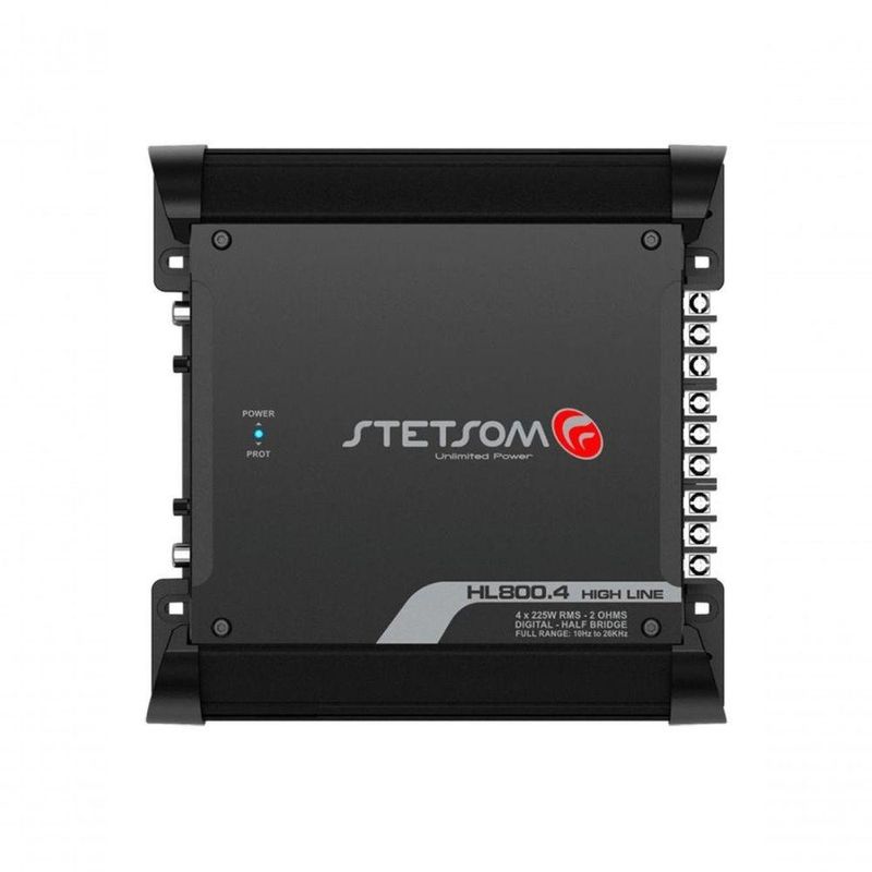Amplificador Digital Stetsom Hl800.4 900w 4 Canais 2 OhmsDescricao Desenvolvido para quem busca alta performance e fidelidade sonora em amplificadores automotivos O HL800.4, e um produto de 900W RMS em 2 Ohms , com 4 CANAIS DE 225W RMS e grande versatilidade de instalacao. Possui recursos independentes nos canais Frontais e Traseiros como o LEVEL para ajustar o nivel do sinal de entrada e Crossover, permitindo escolher entre atuacao em LOW-PASS, HIGH-PASS ou FLAT (FULL-RANGE). DICAS DE COMO PODE SER INSTALADO: 16 tweeters/drivers (cornetas) sendo 4 em paralelo por canal. 2 canais em Bridge de 400W em 4 Ohms (Front, Rear). 3 canais sendo dois independentes de 200W e um em Bridge de 400W. Modo Tri-mod com um alto-falante de 4 Ohms em bridge + 2 cornetas ou 2 super twitters por canal. *Imagens meramente ilustrativas. Especificacao Tecnica Numero de Canais 4 Potencia RMS em 2 Ohms 12,6V 4 x 225W RMS (STEREO) Potencia RMS em 4 Ohms 12,6V 4 x 140W RMS (STEREO) Potencia RMS em 2 Ohms 13,8V 4 x 260W RMS (STEREO) Potencia RMS em 4 Ohms 13,8V 4 x 165W RMS (STEREO) Potencia @ 12.6V Bridge 4 Ohms 2 x 450W RMS Potencia @ 13.8V Bridge 4 Ohms 2 x 520W RMS Tensao de Alimentacao 9V ~ 15V DC Resposta em Frequencia 10Hz ~26KHz Crossover Low Pass 90Hz Crossover High Pass 90Hz Relacao Sinal Ruido>90 dB Distorcao Harmonica>0,4 % THD Sensibilidade de Entrada 200mV Impedancia de Entrada 14K OHMS Impedancia Minima de Saida STEREO 2 OHMS / STEREO 4 OHMS Consumo com Sinal Musical 44A Consumo com Sinal Bass 88A Dimensoes (A x L x C) mm 66 x 206 x 206 mm Peso Kg 1,7 KgDescricao Desenvolvido para quem busca alta performance e fidelidade sonora em amplificadores automotivos O HL800.4, e um produto de 900W RMS em 2 Ohms , com 4 CANAIS DE 225W RMS e grande versatilidade de instalacao. Possui recursos independentes nos canais Frontais e Traseiros como o LEVEL para ajustar o nivel do sinal de entrada e Crossover, permitindo escolher entre atuacao em LOW-PASS, HIGH-PASS ou FLAT (FULL-RANGE). DICAS DE COMO PODE SER INSTALADO: 16 tweeters/drivers (cornetas) sendo 4 em paralelo por canal. 2 canais em Bridge de 400W em 4 Ohms (Front, Rear). 3 canais sendo dois independentes de 200W e um em Bridge de 400W. Modo Tri-mod com um alto-falante de 4 Ohms em bridge + 2 cornetas ou 2 super twitters por canal. *Imagens meramente ilustrativas. Especificacao Tecnica Numero de Canais 4 Potencia RMS em 2 Ohms 12,6V 4 x 225W RMS (STEREO) Potencia RMS em 4 Ohms 12,6V 4 x 140W RMS (STEREO) Potencia RMS em 2 Ohms 13,8V 4 x 260W RMS (STEREO) Potencia RMS em 4 Ohms 13,8V 4 x 165W RMS (STEREO) Potencia @ 12.6V Bridge 4 Ohms 2 x 450W RMS Potencia @ 13.8V Bridge 4 Ohms 2 x 520W RMS Tensao de Alimentacao 9V ~ 15V DC Resposta em Frequencia 10Hz ~26KHz Crossover Low Pass 90Hz Crossover High Pass 90Hz Relacao Sinal Ruido>90 dB Distorcao Harmonica>0,4 % THD Sensibilidade de Entrada 200mV Impedancia de Entrada 14K OHMS Impedancia Minima de Saida STEREO 2 OHMS / STEREO 4 OHMS Consumo com Sinal Musical 44A Consumo com Sinal Bass 88A Dimensoes (A x L x C) mm 66 x 206 x 206 mm Peso Kg 1,7 Kg
