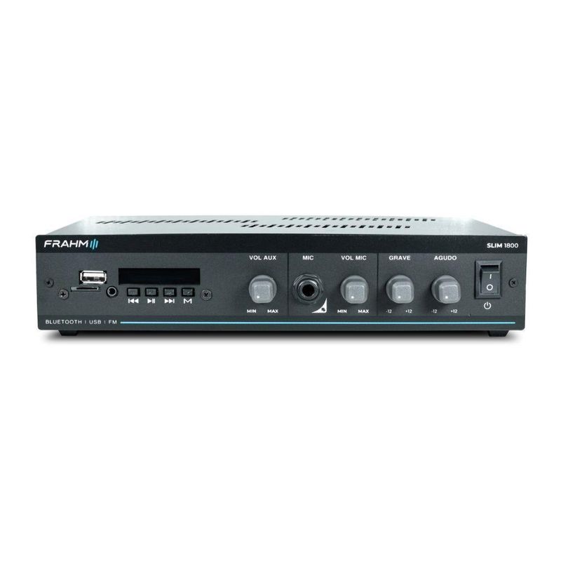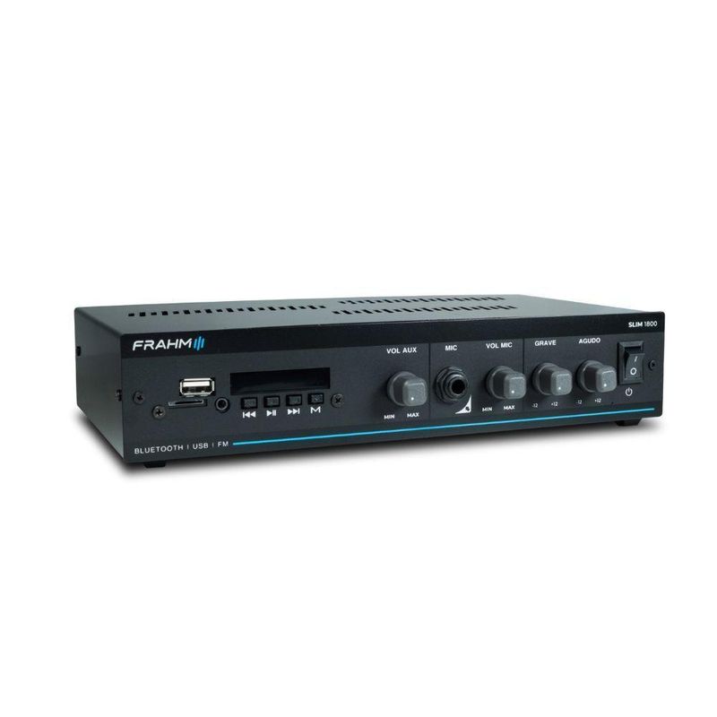 Amplificador Frahm Slim 1000 La G5 (7896673816610)A linha nº1 em amplificador comercias do Brasil, chega em sua quinta geração (G5), trazendo ainda mais tecnologia e um visual único e inovador. Essa geração reflete toda a confiabilidade, sem perder sua essência.O amplificador Slim 1800 G5 com 60 Watts RMS de potência, aceita qualquer número de caixas de sobrepor ou caixas de embutir inferiores a 12 (usa-se de 1 a 12 sem problemas com limite mínimo de impedância). Recomenda-se utilizar com no máximo 35 metros de fio (distância entre a última caixa de embutir ou sobrepor em relação à posição onde ficará o amplificador).Indicação de uso: Recepções, clínicas, conveniências, farmácias, lojas e muitos outros.Benefícios:Visual único e moderno;Ligação de caixas em paralelo;Facilidade em sua operação;Entrada para conexão de microfone;Equalizador;Conexão auxiliar via RCA/P2, USB, Bluetooth, MicroSD.*Imagens meramente ilustrativas.Especificações TécnicasPotência : 60W RMSAmplificador mono : Classe ABNúmero de vias : 2Frequência de atuação : Graves: 90Hz - Agudos: 10KHzSensibilidade do MIC : 18mVSensibilidade do AUX : 350mVBivolt automático : 90-240VDimensões (AxLxP mm) : 69,7x270x165Peso : 1500g