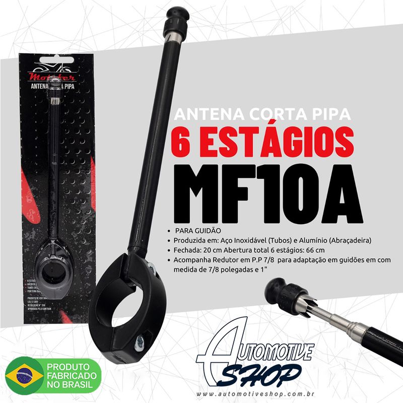 SUA VIDA VALE MUITO. MUITO MAIS SEGURANÇA. Código: MF10A - Antena Retrátil e Reclinável 6 Estágios PARA GUIDÃO; - Produzida em Aço Inoxidável (Tubos) Alumínio (Abraçadeira); - Fechada: 20 cm Abertura total 6 estágios: 66 cm. Acompanha no kit: - redutor em P.P 7/8 para adaptação em guidões em com medida de 7/8 polegadas e 1". A Automotive Shop trás sempre novidades, e para te auxiliar com sua motocicleta trazemos esta antena anti cerol, corta linha de pipa, para te proteger no seu trajeto, seja a passeio seja a trabalho. Imagens meramente ilustrativas. Não nos responsabilizamos por má instalação, leve sempre a um profissional habilitado. A JOJAFER foi fundada em 2003 após o Sr. José Jacob Fernandes ter presenciado um acidente fatal de um motociclista, provocado por linha de pipa. Após refletir sobre o assunto, desenvolveu vários acessórios de segurança "Antena Corta Pipas" para cortar a linha evitando novos acidentes. A aceitação foi instantânea e surgiram dezenas de relatos de linhas cortadas pela antena e pessoas salvas pelo dispositivo.Devido sua eficácia, tornou obrigatório para moto fretistas em todo território nacional.