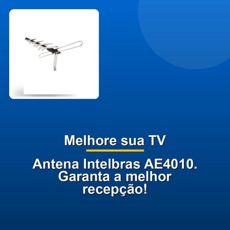 Antena De Tv Externa Intelbras Ae4010 Tv Digital HdtvA Antena de TV Externa Intelbras AE4010 é a solução ideal para quem busca qualidade de imagem superior em canais analógicos e digitais, mesmo em locais com desafios de recepção, como áreas cercadas por montanhas ou edifícios. Este modelo foi projetado para garantir o máximo desempenho na captação de sinal, sendo uma escolha excelente para residências e estabelecimentos que desejam aproveitar ao máximo a tecnologia de TV digital e HDTV. Compatível com todos os televisores, conversores, boosters e amplificadores, ela oferece versatilidade e praticidade para diferentes configurações de equipamentos.Fabricada com materiais de alta resistência e durabilidade, a AE4010 é uma antena externa robusta, pronta para enfrentar as adversidades do ambiente externo sem comprometer sua eficiência. Sua estrutura compacta e de alto poder de captação proporciona maior ganho de sinal, assegurando uma experiência televisiva mais nítida e agradável. Além disso, sua instalação é extremamente simples e rápida, já que a antena vem pré-montada, permitindo economia de tempo e esforços na montagem.O kit completo inclui um mastro com suporte de fixação na parede e 20 metros de cabo coaxial, garantindo flexibilidade na instalação em diferentes locais e distâncias. Com uma ampla frequência de operação que abrange FM, VHF, UHF e HDTV, a AE4010 oferece uma cobertura abrangente para diversas faixas de transmissão, proporcionando acesso a uma maior variedade de canais. Sua confiabilidade e desempenho tornam este produto um investimento indispensável para quem prioriza qualidade e durabilidade.Com a Antena de TV Externa Intelbras AE4010, você terá acesso a imagens de alta definição e uma recepção de sinal consistente, mesmo em condições desafiadoras. Escolha a antena que combina tecnologia avançada, materiais resistentes e facilidade de instalação para transformar sua experiência de entretenimento.A Antena de TV Externa Intelbras AE4010 é a solução ideal para quem busca qualidade de imagem superior em canais analógicos e digitais, mesmo em locais com desafios de recepção, como áreas cercadas por montanhas ou edifícios. Este modelo foi projetado para garantir o máximo desempenho na captação de sinal, sendo uma escolha excelente para residências e estabelecimentos que desejam aproveitar ao máximo a tecnologia de TV digital e HDTV. Compatível com todos os televisores, conversores, boosters e amplificadores, ela oferece versatilidade e praticidade para diferentes configurações de equipamentos.Fabricada com materiais de alta resistência e durabilidade, a AE4010 é uma antena externa robusta, pronta para enfrentar as adversidades do ambiente externo sem comprometer sua eficiência. Sua estrutura compacta e de alto poder de captação proporciona maior ganho de sinal, assegurando uma experiência televisiva mais nítida e agradável. Além disso, sua instalação é extremamente simples e rápida, já que a antena vem pré-montada, permitindo economia de tempo e esforços na montagem.O kit completo inclui um mastro com suporte de fixação na parede e 20 metros de cabo coaxial, garantindo flexibilidade na instalação em diferentes locais e distâncias. Com uma ampla frequência de operação que abrange FM, VHF, UHF e HDTV, a AE4010 oferece uma cobertura abrangente para diversas faixas de transmissão, proporcionando acesso a uma maior variedade de canais. Sua confiabilidade e desempenho tornam este produto um investimento indispensável para quem prioriza qualidade e durabilidade.Com a Antena de TV Externa Intelbras AE4010, você terá acesso a imagens de alta definição e uma recepção de sinal consistente, mesmo em condições desafiadoras. Escolha a antena que combina tecnologia avançada, materiais resistentes e facilidade de instalação para transformar sua experiência de entretenimento.