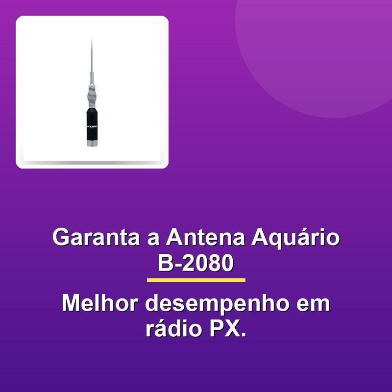 Antena Móvel Aquário B-2080 Bobina E Mola Para Rádio PxExperimente a qualidade e a resistência incomparáveis da Antena Móvel Aquário B-2080, projetada especialmente para entusiastas de rádio PX que enfrentam ambientes desafiadores. Com um design robusto e inovador, esta antena de 123,5 cm é a solução ideal para quem opera em áreas repletas de árvores ou em locais onde os obstáculos são uma constante. A chave para a sua durabilidade reside na sua estrutura equipada com uma mola, que oferece a flexibilidade necessária para a haste de inox, prevenindo danos e garantindo uma vida útil prolongada.Pesando apenas 265 g, a Antena Aquário B-2080 combina leveza com eficiência, proporcionando fácil instalação e manuseio, sem comprometer o desempenho. Desfrute de uma comunicação clara e estável em todas as situações, ampliando seu alcance e mantendo uma conexão confiável independentemente do terreno. O diferencial deste produto está em seu design inteligente, que absorve impactos e minimiza a pressão sobre o suporte e a própria antena, permitindo que você navegue por caminhos complicados sem preocupações.Ao escolher a Antena Móvel Aquário B-2080, você está investindo em uma solução de comunicação superior, feita para suportar os rigores do uso frequente sem falhas. É a escolha perfeita para quem não se contenta com menos do que o melhor em termos de resistência e funcionalidade. Dessa forma, você pode explorar o seu percurso com confiança, sabendo que sua comunicação está segura e livre de interrupções. Transforme sua experiência de rádio PX com a segurança e a eficiência que só a Aquário pode oferecer.Experimente a qualidade e a resistência incomparáveis da Antena Móvel Aquário B-2080, projetada especialmente para entusiastas de rádio PX que enfrentam ambientes desafiadores. Com um design robusto e inovador, esta antena de 123,5 cm é a solução ideal para quem opera em áreas repletas de árvores ou em locais onde os obstáculos são uma constante. A chave para a sua durabilidade reside na sua estrutura equipada com uma mola, que oferece a flexibilidade necessária para a haste de inox, prevenindo danos e garantindo uma vida útil prolongada.Pesando apenas 265 g, a Antena Aquário B-2080 combina leveza com eficiência, proporcionando fácil instalação e manuseio, sem comprometer o desempenho. Desfrute de uma comunicação clara e estável em todas as situações, ampliando seu alcance e mantendo uma conexão confiável independentemente do terreno. O diferencial deste produto está em seu design inteligente, que absorve impactos e minimiza a pressão sobre o suporte e a própria antena, permitindo que você navegue por caminhos complicados sem preocupações.Ao escolher a Antena Móvel Aquário B-2080, você está investindo em uma solução de comunicação superior, feita para suportar os rigores do uso frequente sem falhas. É a escolha perfeita para quem não se contenta com menos do que o melhor em termos de resistência e funcionalidade. Dessa forma, você pode explorar o seu percurso com confiança, sabendo que sua comunicação está segura e livre de interrupções. Transforme sua experiência de rádio PX com a segurança e a eficiência que só a Aquário pode oferecer.