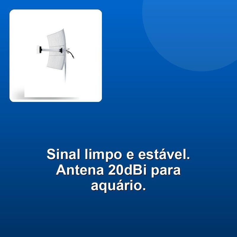 Antena Parabólica Grade Internet Aquário 20dbi 2,4ghzA Antena Parabólica de Grade para Internet Aquário MM-2420 é a solução ideal para quem busca desempenho, durabilidade e eficiência na recepção e transmissão de sinal de internet. Projetada para operar na faixa de frequência de 2.4 GHz a 2.5 GHz, essa antena oferece um ganho impressionante de 20 dBi, garantindo uma conexão estável e de alta qualidade mesmo em ambientes de maior interferência. Sua relação F/B superior a 22 dB e rejeição de polarização de 35 dB asseguram excelente desempenho contra ruídos e interferências, proporcionando uma experiência de uso mais fluida e confiável.Com dimensões de 450 x 600 mm e peso de apenas 1.800 g, a MM-2420 combina robustez e leveza. Produzida com materiais de alta qualidade, como aço carbono, alumínio anodizado, latão cromado e polipropileno, ela conta com um acabamento resistente em pintura a pó poliéster e nanocerâmica, garantindo durabilidade mesmo em condições climáticas adversas. A antena foi projetada para instalação externa e é capaz de suportar ventos de até 100 km/h, com operação estável em velocidades de até 50 km/h, o que a torna ideal para diferentes cenários e regiões.Outro diferencial é sua versatilidade de instalação, com suporte para mastros de diâmetro entre 31 mm e 51 mm, além de permitir polarização linear tanto vertical quanto horizontal, atendendo a diferentes necessidades de configuração. O conector N fêmea e o cabo RGC 213 asseguram uma conexão confiável e de baixa perda, enquanto sua impedância de 50 Ohms e largura de faixa de 120 MHz garantem uma performance consistente. Para maior praticidade, o produto inclui manual de instalação e todos os acessórios necessários, como dipolo, conjunto de abraçadeiras, porcas e arruelas.A Antena Parabólica de Grade para Internet Aquário MM-2420 é a solução ideal para quem busca desempenho, durabilidade e eficiência na recepção e transmissão de sinal de internet. Projetada para operar na faixa de frequência de 2.4 GHz a 2.5 GHz, essa antena oferece um ganho impressionante de 20 dBi, garantindo uma conexão estável e de alta qualidade mesmo em ambientes de maior interferência. Sua relação F/B superior a 22 dB e rejeição de polarização de 35 dB asseguram excelente desempenho contra ruídos e interferências, proporcionando uma experiência de uso mais fluida e confiável.Com dimensões de 450 x 600 mm e peso de apenas 1.800 g, a MM-2420 combina robustez e leveza. Produzida com materiais de alta qualidade, como aço carbono, alumínio anodizado, latão cromado e polipropileno, ela conta com um acabamento resistente em pintura a pó poliéster e nanocerâmica, garantindo durabilidade mesmo em condições climáticas adversas. A antena foi projetada para instalação externa e é capaz de suportar ventos de até 100 km/h, com operação estável em velocidades de até 50 km/h, o que a torna ideal para diferentes cenários e regiões.Outro diferencial é sua versatilidade de instalação, com suporte para mastros de diâmetro entre 31 mm e 51 mm, além de permitir polarização linear tanto vertical quanto horizontal, atendendo a diferentes necessidades de configuração. O conector N fêmea e o cabo RGC 213 asseguram uma conexão confiável e de baixa perda, enquanto sua impedância de 50 Ohms e largura de faixa de 120 MHz garantem uma performance consistente. Para maior praticidade, o produto inclui manual de instalação e todos os acessórios necessários, como dipolo, conjunto de abraçadeiras, porcas e arruelas.