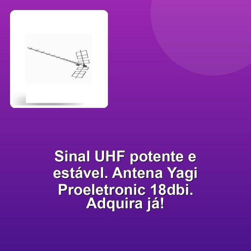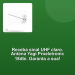 Antena Uhf Digital Yagi Alto Ganho Proeletronic 18dbiA antena digital PROELETRONIC YAGI é a escolha perfeita para quem busca qualidade excepcional na recepção de sinais de TV digital e analógica na faixa UHF, cobrindo os canais de 14 a 69. Com sua estrutura robusta e alto ganho de 18 dBi, esta antena garante uma recepção estável e de alta performance, mesmo em condições desafiadoras de campo. Seja para uso em áreas urbanas ou rurais, ela entrega um sinal claro e livre de interferências, proporcionando uma experiência de entretenimento superior.Um dos grandes diferenciais do modelo PROHD-1118 é sua estrutura bipartida, que oferece maior praticidade no transporte e armazenamento. Essa inovação reduz significativamente o volume em comparação com modelos anteriores, tornando-a ideal para envios de longa distância, especialmente em e-commerces. Por ser compacta, é perfeita para ser despachada pelos Correios, otimizando custos logísticos e garantindo que chegue ao destino em perfeitas condições.Além de sua funcionalidade avançada, a antena apresenta especificações técnicas que reforçam sua eficiência. Com uma frequência de operação que varia entre 470 e 806 MHz e uma impedância de 75/300 Ohms, ela é projetada para atender às demandas mais exigentes. Com 13 elementos e dimensões de 1270 x 320 x 152 mm, o modelo combina design inteligente com leveza, pesando apenas 750 g, o que facilita sua instalação e manuseio.Seja para ampliar sua experiência com TV digital ou para garantir uma recepção estável em locais com sinal mais fraco, a antena PROELETRONIC YAGI é a solução ideal. Combinando tecnologia de ponta, durabilidade e praticidade, ela se destaca como uma das melhores opções do mercado para quem valoriza desempenho e qualidade.A antena digital PROELETRONIC YAGI é a escolha perfeita para quem busca qualidade excepcional na recepção de sinais de TV digital e analógica na faixa UHF, cobrindo os canais de 14 a 69. Com sua estrutura robusta e alto ganho de 18 dBi, esta antena garante uma recepção estável e de alta performance, mesmo em condições desafiadoras de campo. Seja para uso em áreas urbanas ou rurais, ela entrega um sinal claro e livre de interferências, proporcionando uma experiência de entretenimento superior.Um dos grandes diferenciais do modelo PROHD-1118 é sua estrutura bipartida, que oferece maior praticidade no transporte e armazenamento. Essa inovação reduz significativamente o volume em comparação com modelos anteriores, tornando-a ideal para envios de longa distância, especialmente em e-commerces. Por ser compacta, é perfeita para ser despachada pelos Correios, otimizando custos logísticos e garantindo que chegue ao destino em perfeitas condições.Além de sua funcionalidade avançada, a antena apresenta especificações técnicas que reforçam sua eficiência. Com uma frequência de operação que varia entre 470 e 806 MHz e uma impedância de 75/300 Ohms, ela é projetada para atender às demandas mais exigentes. Com 13 elementos e dimensões de 1270 x 320 x 152 mm, o modelo combina design inteligente com leveza, pesando apenas 750 g, o que facilita sua instalação e manuseio.Seja para ampliar sua experiência com TV digital ou para garantir uma recepção estável em locais com sinal mais fraco, a antena PROELETRONIC YAGI é a solução ideal. Combinando tecnologia de ponta, durabilidade e praticidade, ela se destaca como uma das melhores opções do mercado para quem valoriza desempenho e qualidade.