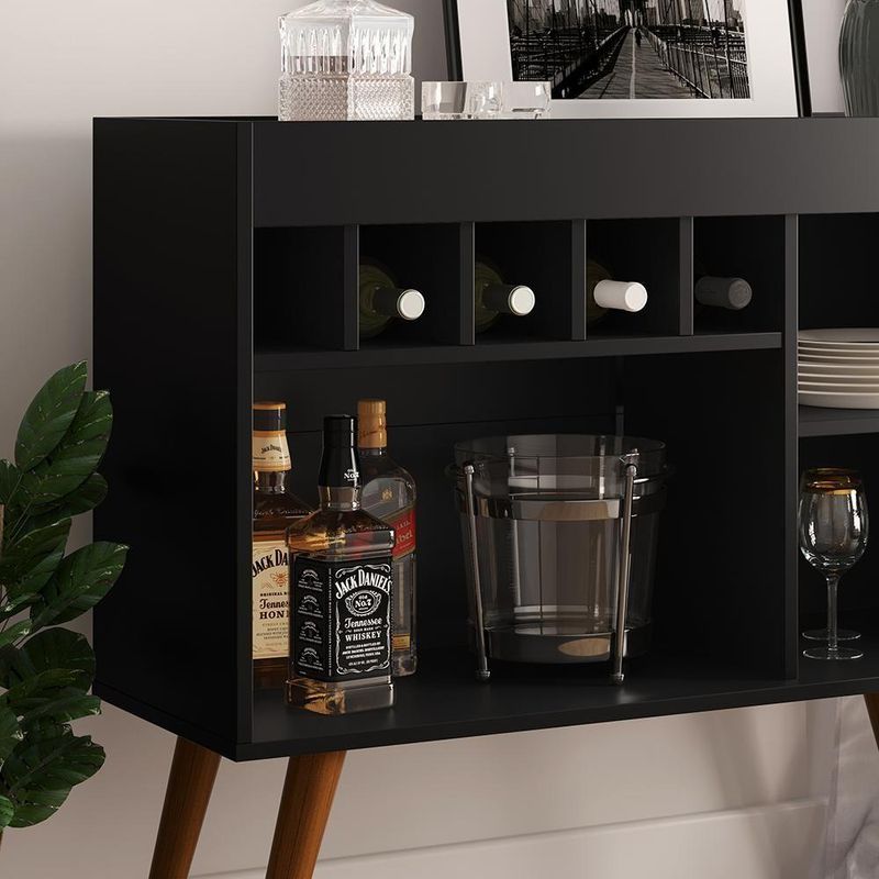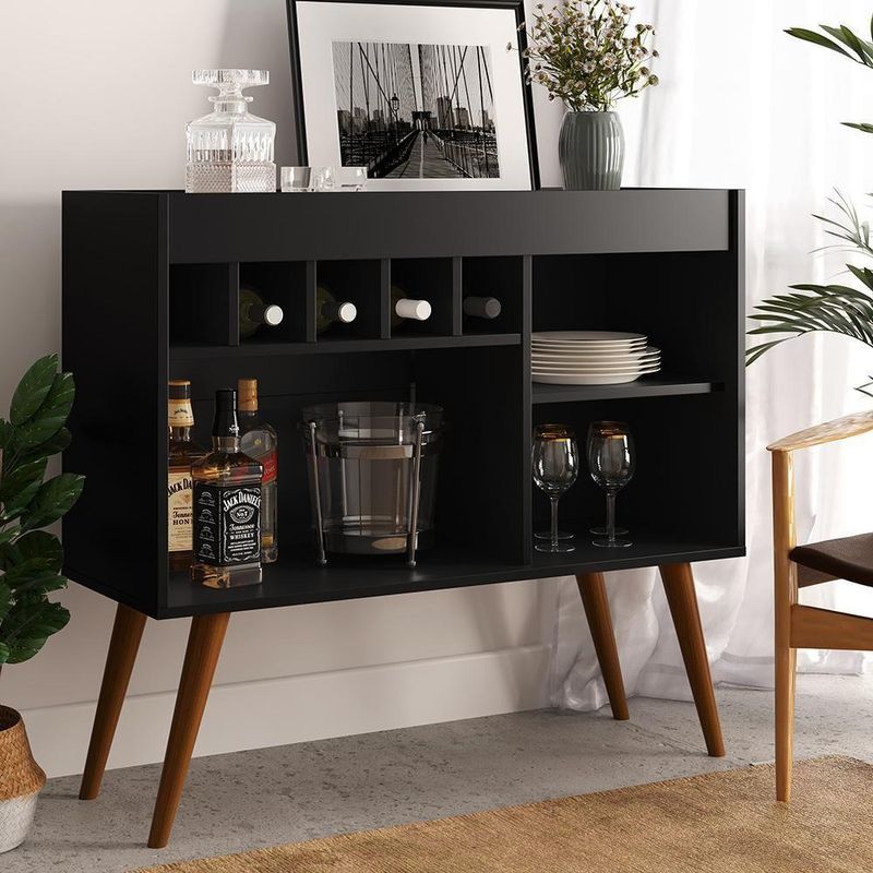 Aparador Adega Odin - Pés Palito Retrô E Mdp Preto - Ej Móveis PretoO Aparador Adega Odin - Movelove é a escolha perfeita para quem busca design charmoso, funcionalidade e praticidade em um único móvel. Compacto e elegante, possui pés palito retrô e adega para 5 garrafas, tornando-o ideal para complementar diversos ambientes, como salas de estar, salas de jantar ou áreas de lazer.Características TécnicasDimensões:- Altura: 84 cm- Largura: 93 cm- Profundidade: 35 cmMateriais:- Estrutura: MDPDetalhes Estruturais:- 4 pés em madeira maciça (estilo palito retrô)- Adega para 5 garrafas- Tampo superior estilo bandejaAcabamento:- Pintura em UV e PUBenefícios e Funcionalidades- Estilo Compacto e Moderno: O design retrô dos pés palito, aliado ao tampo estilo bandeja, confere charme e originalidade ao ambiente.- Espaço para Adega: Capacidade para armazenar 5 garrafas, mantendo-as sempre à mão e organizadas.- Funcionalidade Versátil: Nicho adicional para decoração ou armazenamento de utensílios, livros, objetos pessoais, entre outros.- Durabilidade: A estrutura em MDP e os pés de madeira maciça garantem resistência e longa vida útil do móvel.Observações Importantes- Imagens meramente ilustrativas.- Não usar produtos abrasivos para limpeza; utilize apenas pano seco ou levemente umedecido.- Não expor diretamente ao sol, calor ou umidade excessiva.- Dimensões da caixa (): 38 cm x 95 cm x 12 cm (C x L x A).- Verifique a embalagem no momento do . Em caso de irregularidade, recuse a e nos contate imediatamente.Conteúdo da Embalagem- 1 Aparador Adega Odin - Movelove- 1 Manual de instruçõesAparador, Adega, Odin, Movelove, Pés Palito, Estilo Retrô, Bandeja Superior, Sala de Estar, Sala de Jantar, Decoração, Compacto, MDP, Madeira Maciça, Nicho, Armazenamento, Funcionalidade, Moderno, Resistência, Montagem, Móveis. Cor: Preto | Quantidade de caixas de embalagem: | Cor: Preto