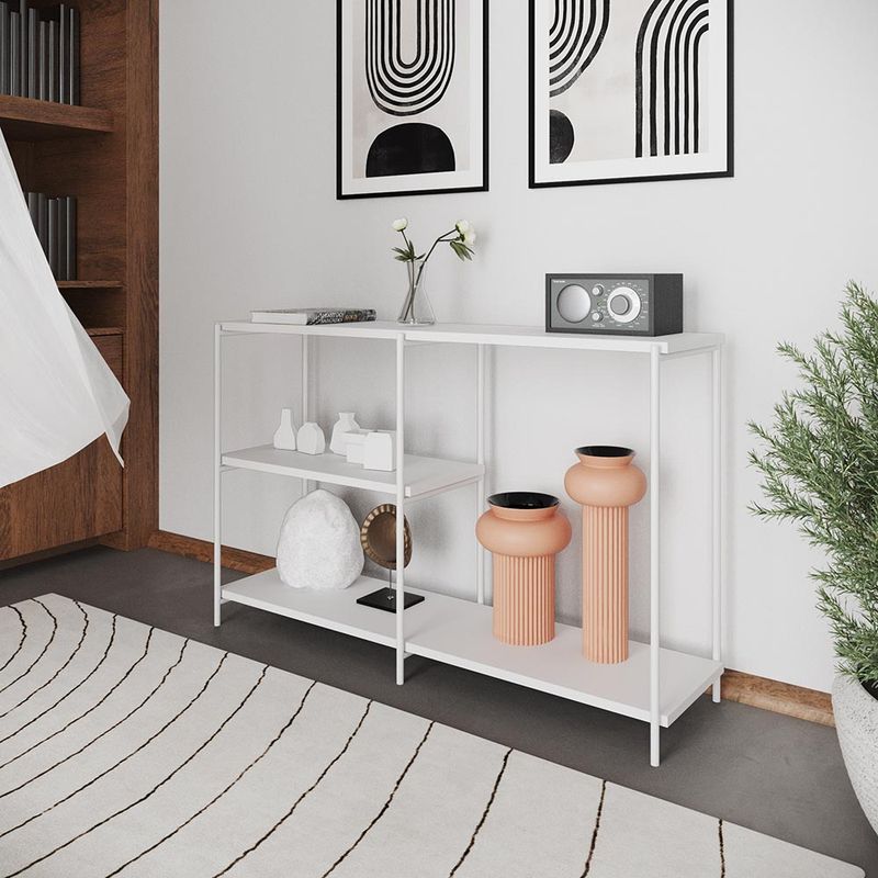 Precisando daquele móvel curinga para criar um belo hall de entrada ou usar em outros cômodos da casa? Então aposte no Aparador Artesania. Versátil, ele pode receber objetos de uso diário, como chaves, carteiras e bolsas, ou servir como um expositor de peças decorativas. Com design moderno que destaca a estrutura em aço, este móvel flerta com o estilo industrial, mas é supersimples de combinar com qualquer decoração, graças às suas cores atemporais. Lindo, né? Medidas: Altura 75 cm Largura 120 cm Profundidade 33 cm Materiais: Aço carbono MDF Pintura eletrostática Suporta até 15 kg por prateleira