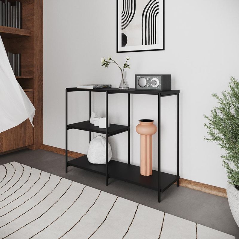 Precisando daquele móvel curinga para criar um belo hall de entrada ou usar em outros cômodos da casa? Então aposte no Aparador Artesania. Versátil, ele pode receber objetos de uso diário, como chaves, carteiras e bolsas, ou servir como um expositor de peças decorativas. Com design moderno que destaca a estrutura em aço, este móvel flerta com o estilo industrial, mas é supersimples de combinar com qualquer decoração, graças às suas cores atemporais. Lindo, né? Medidas: Altura 75 cm Largura 95 cm Profundidade 33 cm Materiais: Aço carbono MDF Pintura eletrostática Suporta até 15 kg por prateleira