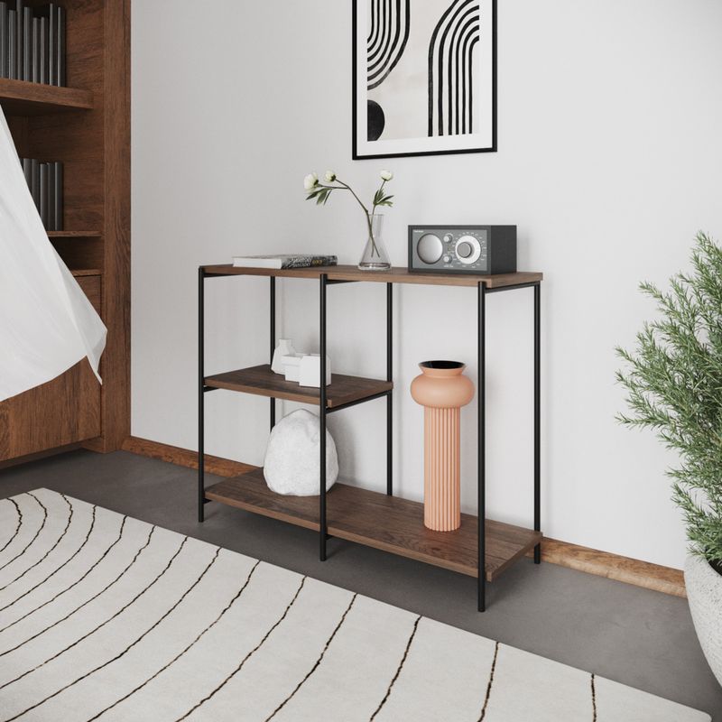 Precisando daquele móvel curinga para criar um belo hall de entrada ou usar em outros cômodos da casa? Então aposte no Aparador Artesania. Versátil, ele pode receber objetos de uso diário, como chaves, carteiras e bolsas, ou servir como um expositor de peças decorativas. Com design moderno que destaca a estrutura em aço, este móvel flerta com o estilo industrial, mas é supersimples de combinar com qualquer decoração, graças às suas cores atemporais. Lindo, né? Suporta até 15 kg por prateleira