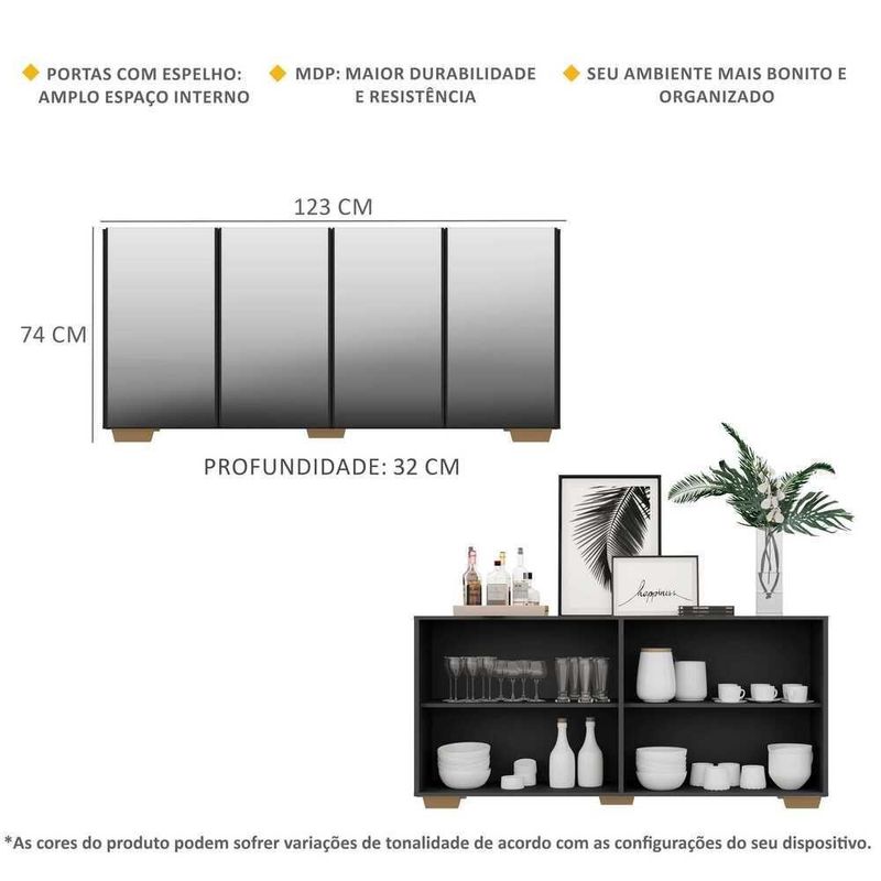 O Aparador Buffet 4 portas com Espelho e Pés Quadrados Vegas é produzido em MDP, que garante maior durabilidade, além de um acabamento superior. Com 4 portas, possui acabamento acetinado (cerca de 20% de brilho) e um excelente espaço interno para organizar seus pertences (as prateleiras internas suportam 5 Kg cada e o tampo 10 Kg). Os pés quadrados, em polipropileno, facilitam na hora da limpeza. Os detalhes com espelhos nas portas deixam o móvel mais requintado, criando um ambiente moderno e charmoso. Os espelhos são de vidro (o que evita que a imagem fique distorcida) e lapidados, ou seja, passam por um processo para que as bordas não fiquem cortantes, o que garante maior . Seu design minimalista, torna o móvel muito versátil, podendo ser utilizado de diversas maneiras e em qualquer ambiente. Conteúdo da Embalagem:1 (um) aparador1 (um) kit com 5 pés quadrados1 (um) kit com 4 espelhosDimensões do produto montado:Altura: 74cm | Largura: 123cm | Profundidade: 32cm*Você pode consultar as medidas internas na imagem técnica do produto.*As cores do produto podem sofrer variações de tonalidade de acordo com as configurações do seu dispositivo.*Obrigatório fixar na parede.Imagem meramente ilustrativa. Decoração e eletros não acompanham o produto.O produto será entregue desmontado e não disponibilizamos o de montagem.