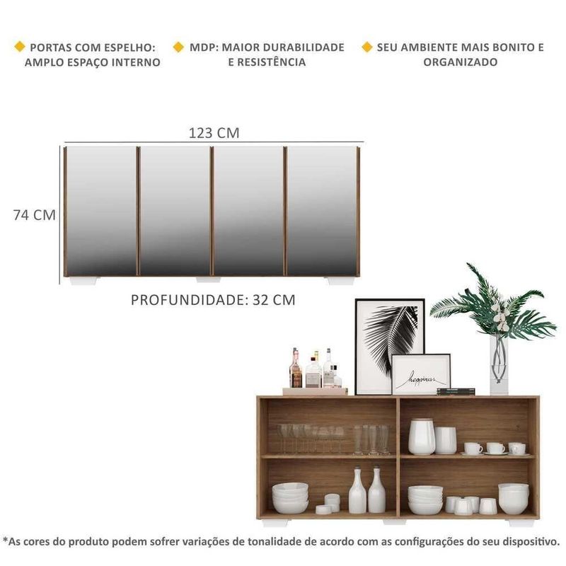 O Aparador Buffet 4 portas com Espelho e Pés Quadrados Vegas é produzido em MDP, que garante maior durabilidade, além de um acabamento superior. Com 4 portas, possui acabamento acetinado (cerca de 20% de brilho) e um excelente espaço interno para organizar seus pertences (as prateleiras internas suportam 5 Kg cada e o tampo 10 Kg). Os pés quadrados, em polipropileno, facilitam na hora da limpeza. Os detalhes com espelhos nas portas deixam o móvel mais requintado, criando um ambiente moderno e charmoso. Os espelhos são de vidro (o que evita que a imagem fique distorcida) e lapidados, ou seja, passam por um processo para que as bordas não fiquem cortantes, o que garante maior . Seu design minimalista, torna o móvel muito versátil, podendo ser utilizado de diversas maneiras e em qualquer ambiente. Conteúdo da Embalagem:1 (um) aparador1 (um) kit com 5 pés quadrados1 (um) kit com 4 espelhosDimensões do produto montado:Altura: 74cm | Largura: 123cm | Profundidade: 32cm*Você pode consultar as medidas internas na imagem técnica do produto.*As cores do produto podem sofrer variações de tonalidade de acordo com as configurações do seu dispositivo.*Obrigatório fixar na parede.Imagem meramente ilustrativa. Decoração e eletros não acompanham o produto.O produto será entregue desmontado e não disponibilizamos o de montagem.