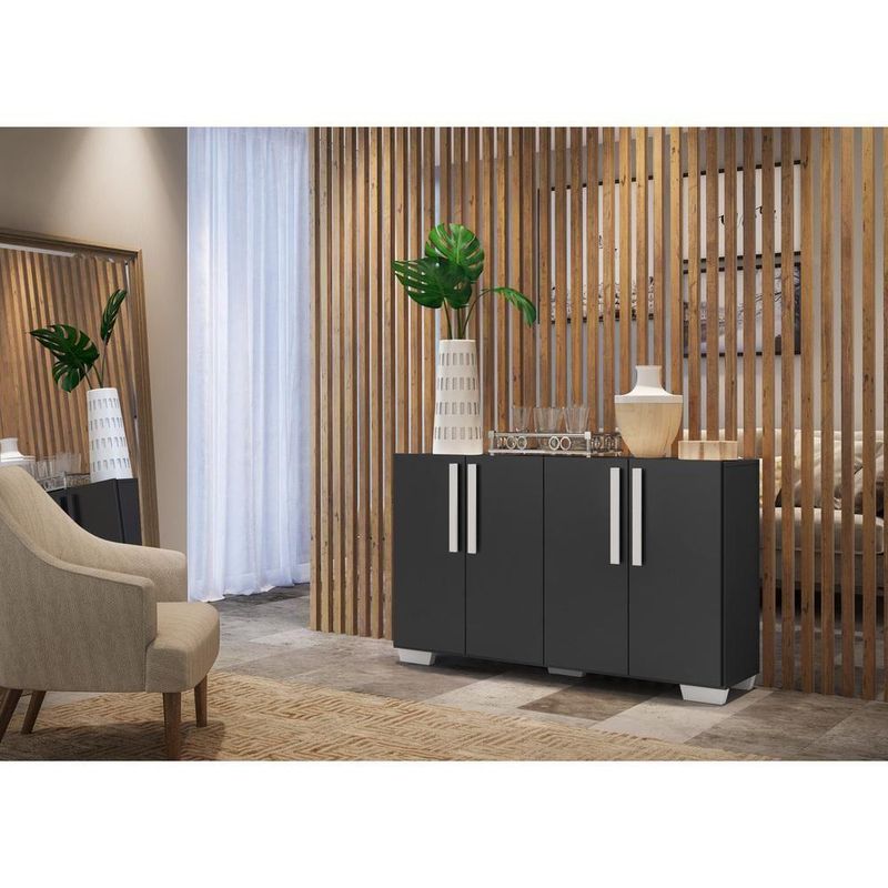O Aparador Buffet 4 Portas com Pés Quadrados Viena Multimóveis é produzido em MDP com acabamento acetinado (cerca de 20% de brilho), que garante maior durabilidade, além de um acabamento superior. Com 4 portas e puxadores em madeira, possui um excelente espaço interno para organizar seus pertences (as prateleiras internas suportam 5 Kg cada e o tampo 10 Kg). Os pés quadrados, em polipropileno, facilitam na hora da limpeza. Seu design minimalista, torna o móvel muito versátil, podendo ser utilizado de diversas maneiras e em qualquer ambiente. Conteúdo da Embalagem:1 (um) aparador1 (um) kit com 4 puxadores1 (um) kit com 5 pés quadradosDimensões do produto montado:Altura: 74cm | Largura: 123cm | Profundidade: 32cm*Você pode consultar as medidas internas na imagem técnica do produto.*As cores do produto podem sofrer variações de tonalidade de acordo com as configurações do seu dispositivo.*Obrigatório fixar na parede.Imagem meramente ilustrativa. Decoração e eletros não acompanham o produto.O produto será entregue desmontado e não disponibilizamos o de montagem.