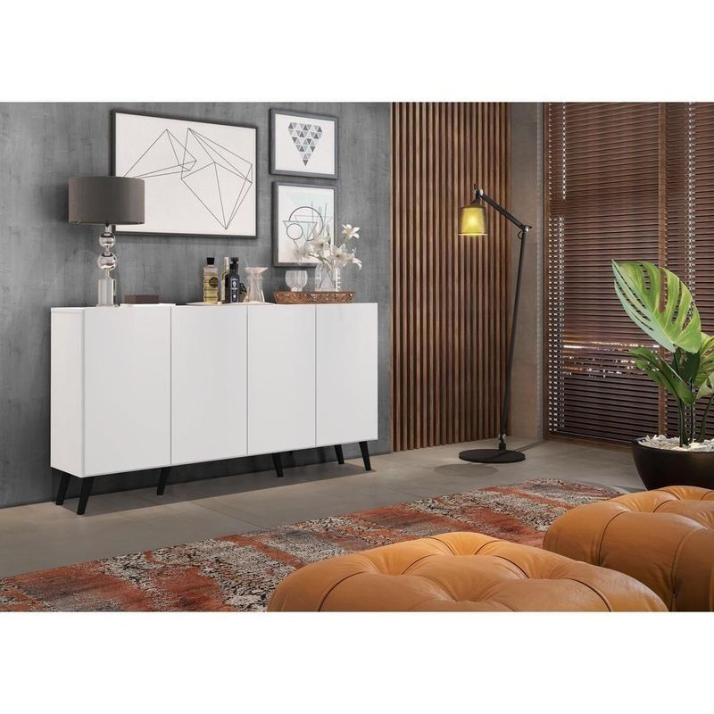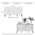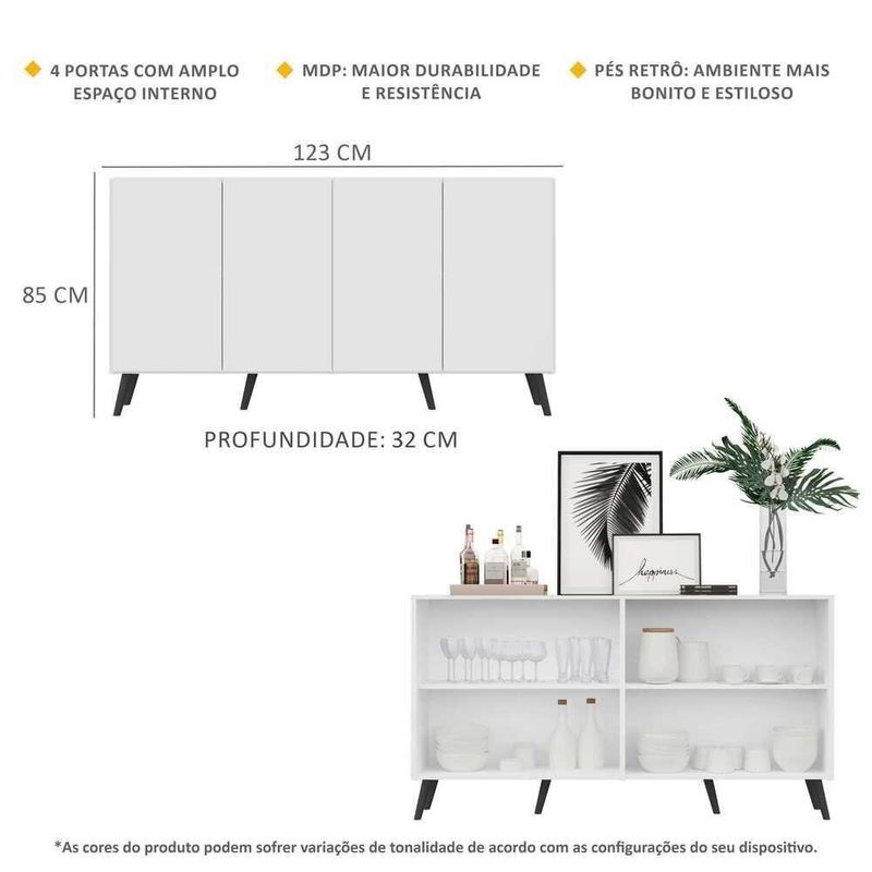 O Aparador Buffet 4 portas com Pés Retrô Veneza Multimóveis é produzido em MDP com acabamento acetinado (cerca de 20% de brilho), que garante maior durabilidade, facilidade na limpeza, além de um acabamento superior. Com 4 portas, possui um excelente espaço interno para organizar seus pertences (as prateleiras internas suportam 5 Kg cada e o tampo 10 Kg). Os pés retrô, em polipropileno, dão um charme especial ao móvel deixando-o com um visual leve e permitindo você compor um ambiente com ar vintage e moderno ao mesmo tempo. Seu design minimalista, torna o móvel muito versátil, podendo ser utilizado de diversas maneiras e em qualquer ambiente. Conteúdo da Embalagem:1 (um) Aparador1 (um) Kit com 6 pés retrôKit ferragemManual de montagemDimensões do produto montado:Altura: 85cm | Largura: 123cm | Profundidade: 32cm*Você pode consultar as medidas detalhadas na imagem técnica do produto.*As cores do produto podem sofrer variações de tonalidade de acordo com as configurações do seu dispositivo.*Obrigatório fixar na parede.Imagem meramente ilustrativa. Decoração não acompanha o produto.O produto será entregue desmontado e não disponibilizamos o serviço de montagem.