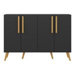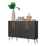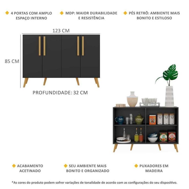 O Aparador Buffet 4 Portas com Pés Retrô Viena Multimóveis é produzido em MDP com acabamento acetinado (cerca de 20% de brilho), que garante maior durabilidade, facilidade na limpeza, além de um acabamento superior. Com 4 portas e puxadores em madeira, possui um excelente espaço interno para organizar seus pertences (as prateleiras internas suportam 5 Kg cada e o tampo 10 Kg). Os pés retrô, em polipropileno, dão um charme especial ao móvel deixando-o com um visual leve e permitindo você compor um ambiente com ar vintage e moderno ao mesmo tempo. Seu design minimalista, torna o móvel muito versátil, podendo ser utilizado de diversas maneiras e em qualquer ambiente.Conteúdo da Embalagem:1 (um) aparador1 (um) kit com 4 puxadores1 (um) kit com 6 pés retrôDimensões do produto montado:Altura: 85cm | Largura: 123cm | Profundidade: 32cm*Você pode consultar as medidas internas na imagem técnica do produto.*As cores do produto podem sofrer variações de tonalidade de acordo com as configurações do seu dispositivo.*Obrigatório fixar na parede.Imagem meramente ilustrativa. Decoração e eletros não acompanham o produto.O produto será entregue desmontado e não disponibilizamos o serviço de montagem.
