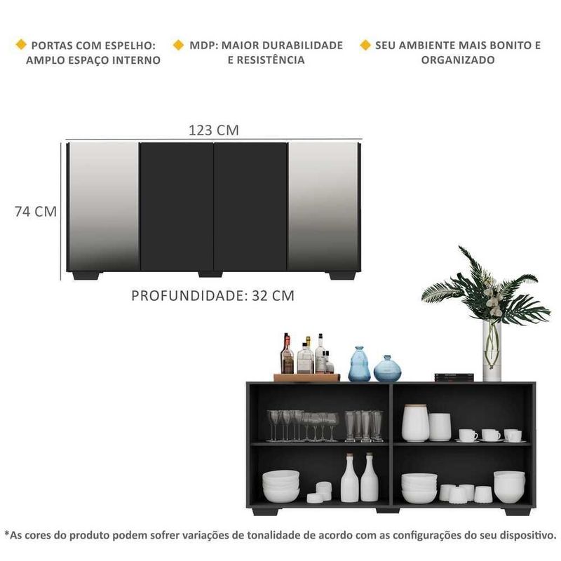 O Aparador Buffet com Espelho e Pés Quadrados Vegas Multimóveis é produzido em MDP, que garante maior durabilidade, além de um acabamento superior. Com 4 portas, possui acabamento acetinado (cerca de 20% de brilho) e um excelente espaço interno para organizar seus pertences (as prateleiras internas suportam 5 Kg cada e o tampo 10 Kg). Os pés quadrados, em polipropileno, facilitam na hora da limpeza. Os detalhes com espelhos nas portas deixam o móvel mais requintado, criando um ambiente moderno e charmoso. Os espelhos são de vidro (o que evita que a imagem fique distorcida) e lapidados, ou seja, passam por um processo para que as bordas não fiquem cortantes, o que garante maior segurança. Seu design minimalista, torna o móvel muito versátil, podendo ser utilizado de diversas maneiras e em qualquer ambiente. Conteúdo da Embalagem:1 (um) aparador1 (um) kit com 5 pés quadrados1 (um) kit com 2 espelhosDimensões do produto montado:Altura: 74cm | Largura: 123cm | Profundidade: 32cm*Você pode consultar as medidas internas na imagem técnica do produto.*As cores do produto podem sofrer variações de tonalidade de acordo com as configurações do seu dispositivo.*Obrigatório fixar na parede.Imagem meramente ilustrativa. Decoração e eletros não acompanham o produto.O produto será entregue desmontado e não disponibilizamos o serviço de montagem.