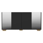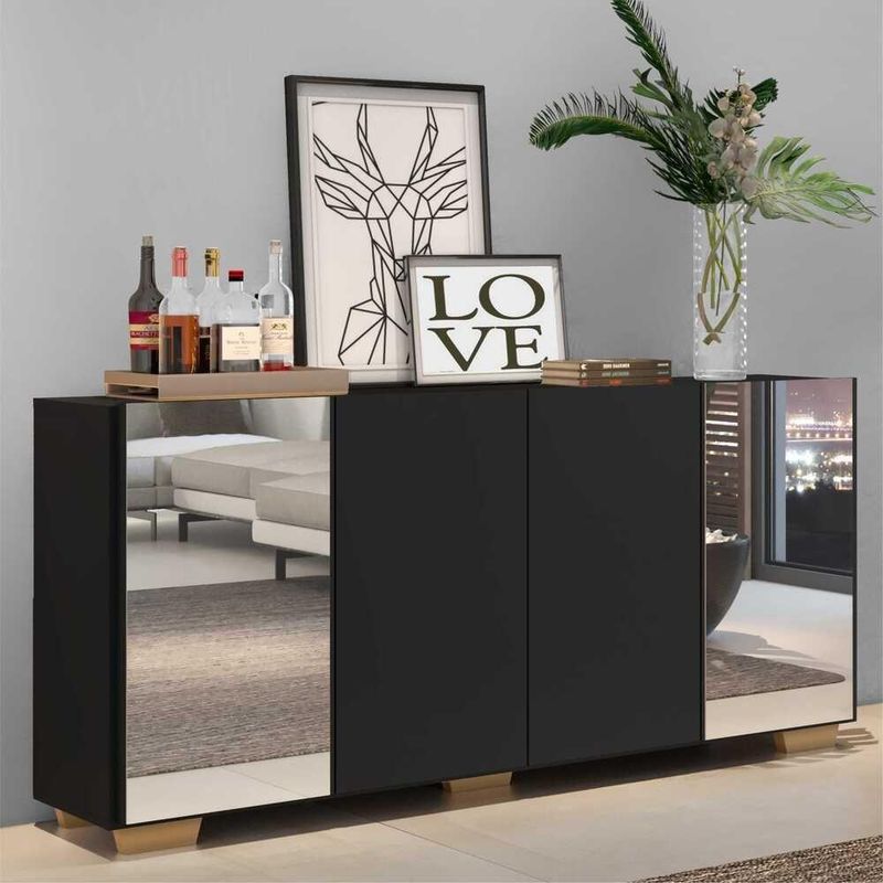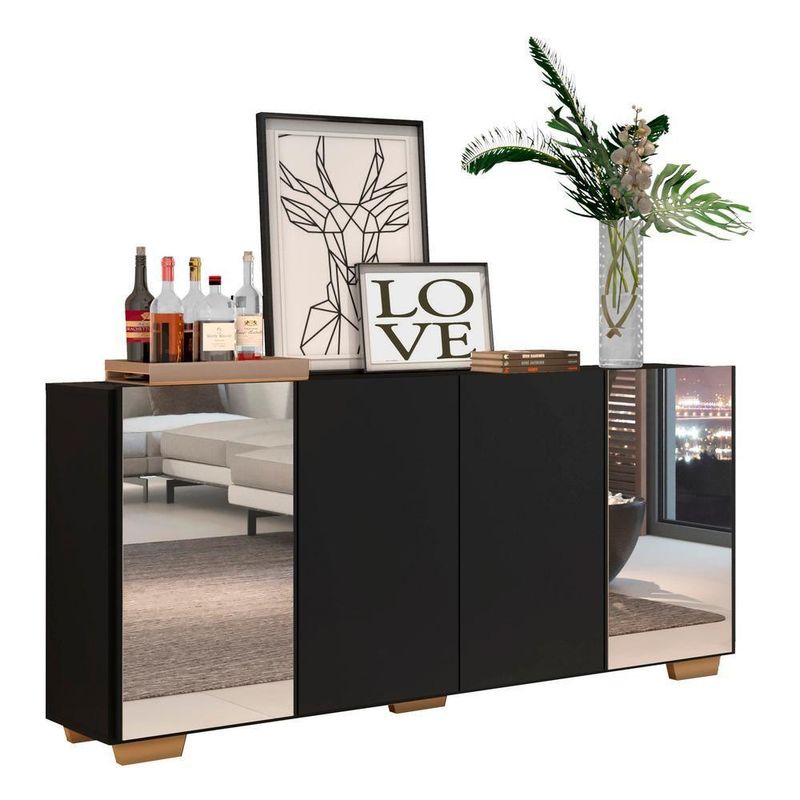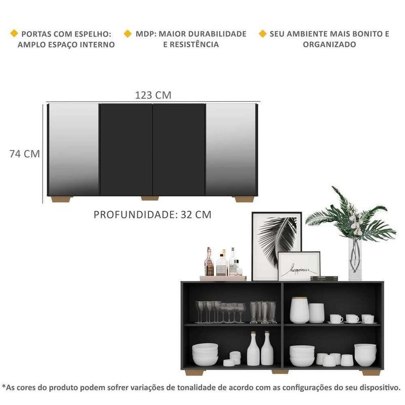 O Aparador Buffet com Espelho e Pés Quadrados Vegas Multimóveis é produzido em MDP, que garante maior durabilidade, além de um acabamento superior. Com 4 portas, possui acabamento acetinado (cerca de 20% de brilho) e um excelente espaço interno para organizar seus pertences (as prateleiras internas suportam 5 Kg cada e o tampo 10 Kg). Os pés quadrados, em polipropileno, facilitam na hora da limpeza. Os detalhes com espelhos nas portas deixam o móvel mais requintado, criando um ambiente moderno e charmoso. Os espelhos são de vidro (o que evita que a imagem fique distorcida) e lapidados, ou seja, passam por um processo para que as bordas não fiquem cortantes, o que garante maior . Seu design minimalista, torna o móvel muito versátil, podendo ser utilizado de diversas maneiras e em qualquer ambiente. Conteúdo da Embalagem:1 (um) aparador1 (um) kit com 5 pés quadrados1 (um) kit com 2 espelhosDimensões do produto montado:Altura: 74cm | Largura: 123cm | Profundidade: 32cm*Você pode consultar as medidas internas na imagem técnica do produto.*As cores do produto podem sofrer variações de tonalidade de acordo com as configurações do seu dispositivo.*Obrigatório fixar na parede.Imagem meramente ilustrativa. Decoração e eletros não acompanham o produto.O produto será entregue desmontado e não disponibilizamos o de montagem.