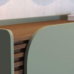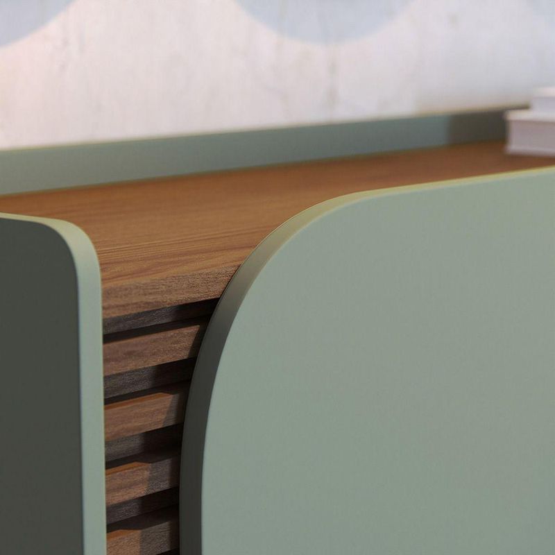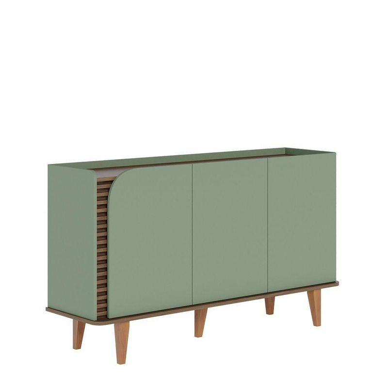 Aparador Buffet Jurere 136cm 3 Portas De Giro - Ssx Multicoisas Cor Hortelã/amendoaBuffet JurerêDeslumbre-se com o Buffet Jurerê, uma fusão perfeita de design retrô e contemporâneo, evidenciado pelos seus 05 pés de madeira maciça e linhas orgânicas. Destaca-se pelos apliques ripados com 20mm de profundidade, realçados pela porta de quina usinada.O tampo amadeirado, elegantemente recuado, proporciona a sensação de uma bandeja, definindo o caráter único deste buffet. Sua base com quinas arredondadas adiciona um toque suave à estrutura. Com 03 portas de giro, o interior revela prateleiras reforçadas, perfeitas para a organização de louças.Especificações do ProdutoMaterial do produto: MDP 15mm, MDP 12mm, MDF 15mm, HDF 3mm;Sistema de montagem: Kit de ferragens e manual de montagem;Instruções de Limpeza: Limpar utilizando apenas um pano umedecido com água, nunca utilizar abrasivos ou esponjas de aço.DimensõesLargura: 136 cmAltura: 79,2 cmProfundidade: 39,3 cmPeso: 35 kg