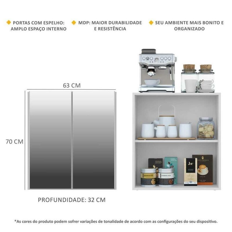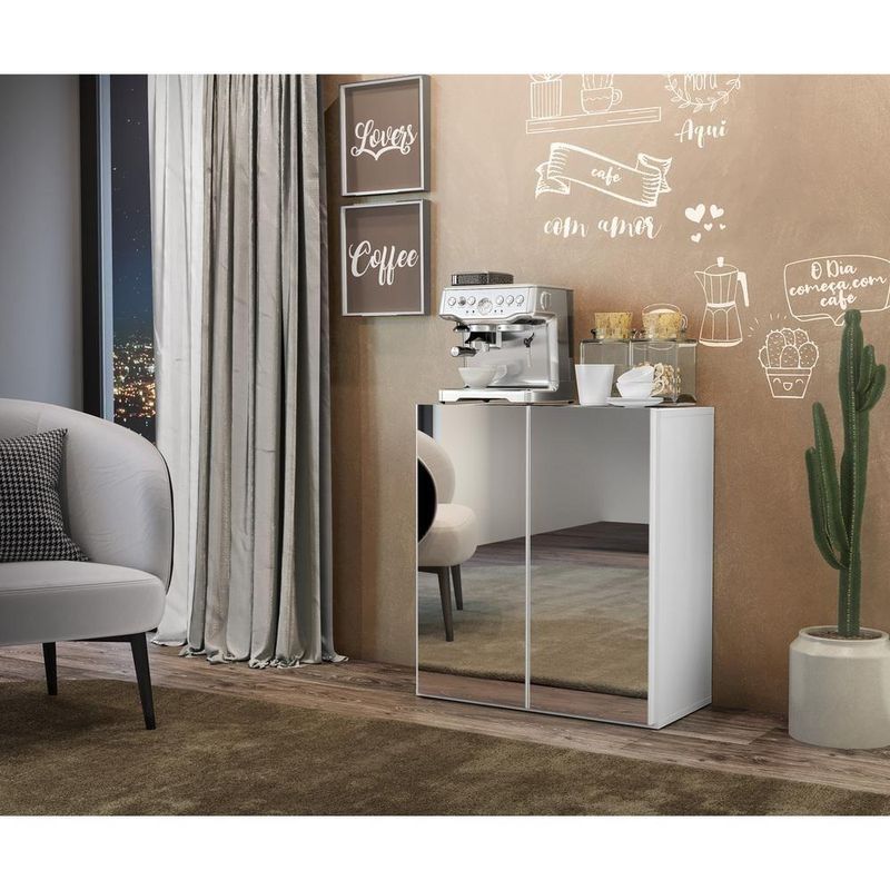 O Aparador Cantinho do Café com Espelho 2 Portas Multimóveis é produzido em MDP com acabamento acetinado (cerca de 20% de brilho), que garante maior durabilidade, facilidade na limpeza, além de um acabamento superior. Com 2 portas, possui um excelente espaço interno para organizar louças, bebidas e demais objetos (a prateleira interna suporta 8 Kg e o tampo 9 Kg). Os detalhes com espelhos nas portas deixam o móvel mais requintado, criando um ambiente moderno e charmoso. Os espelhos são de vidro (o que evita que a imagem fique distorcida) e lapidados, ou seja, passam por um processo para que as bordas não fiquem cortantes, o que garante maior . Os amantes de café poderão deixar seu cantinho mais prático e aconchegante para curtir os melhores os com os amigos e família, saboreando um delicioso cafezinho.Conteúdo da Embalagem:1 (um) aparador1 (um) kit com 2 espelhosDimensões do produto montado:Altura: 70cm | Largura: 63cm | Profundidade: 32cm*Você pode consultar as medidas internas na imagem técnica do produto.*As cores do produto podem sofrer variações de tonalidade de acordo com as configurações do seu dispositivo.Imagem meramente ilustrativa. Decoração e eletros não acompanham o produto.O produto será entregue desmontado e não disponibilizamos o de montagem.