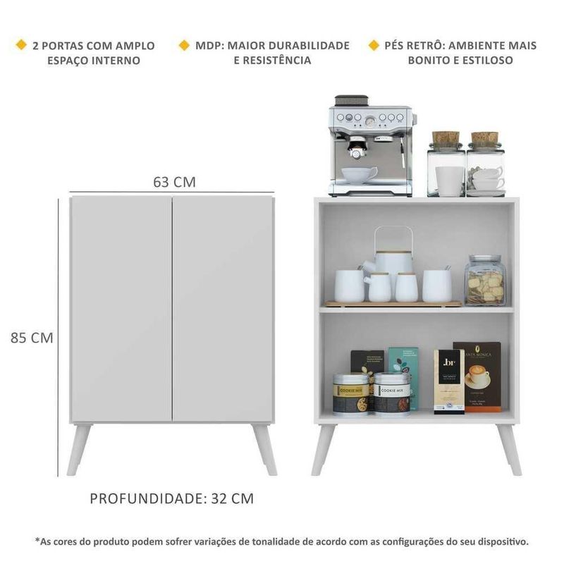 O Aparador Cantinho do Café com Pés Retrô e 2 Portas Multimóveis é produzido em MDP com acabamento acetinado (cerca de 20% de brilho), que garante maior durabilidade, facilidade na limpeza, além de um acabamento superior. Com 2 portas, possui um excelente espaço interno para organizar louças, bebidas e demais objetos (a prateleira interna suporta 8 Kg e o tampo 9 Kg). Os pés retrô, em polipropileno, dão um charme especial ao móvel deixando-o com um visual leve e permitindo você compor um ambiente com ar vintage e moderno ao mesmo tempo. Os amantes de café poderão deixar seu cantinho mais charmoso e prático para curtir os melhores momentos com os amigos e família, saboreando um delicioso cafezinho.Conteúdo da Embalagem:1 (um) aparador1 (um) kit com 4 pés retrôDimensões do produto montado:Altura: 85cm | Largura: 63cm | Profundidade: 32cm*Você pode consultar as medidas internas na imagem técnica do produto.*As cores do produto podem sofrer variações de tonalidade de acordo com as configurações do seu dispositivo.Imagem meramente ilustrativa. Decoração e eletros não acompanham o produto.O produto será entregue desmontado e não disponibilizamos o serviço de montagem.