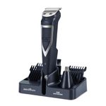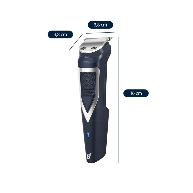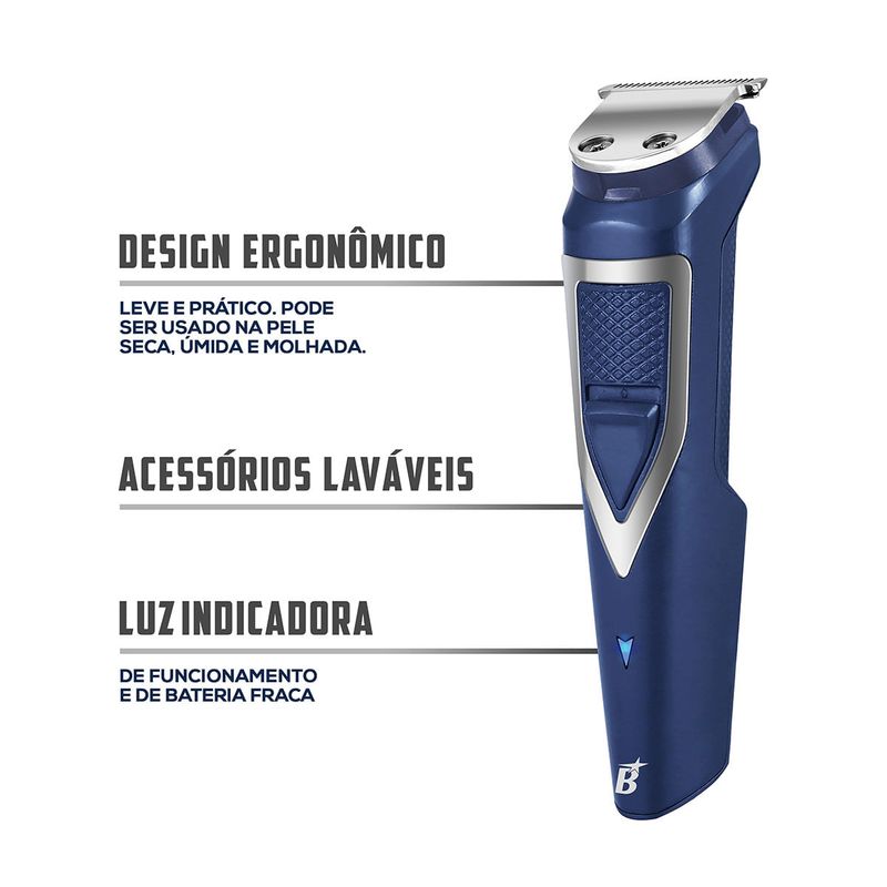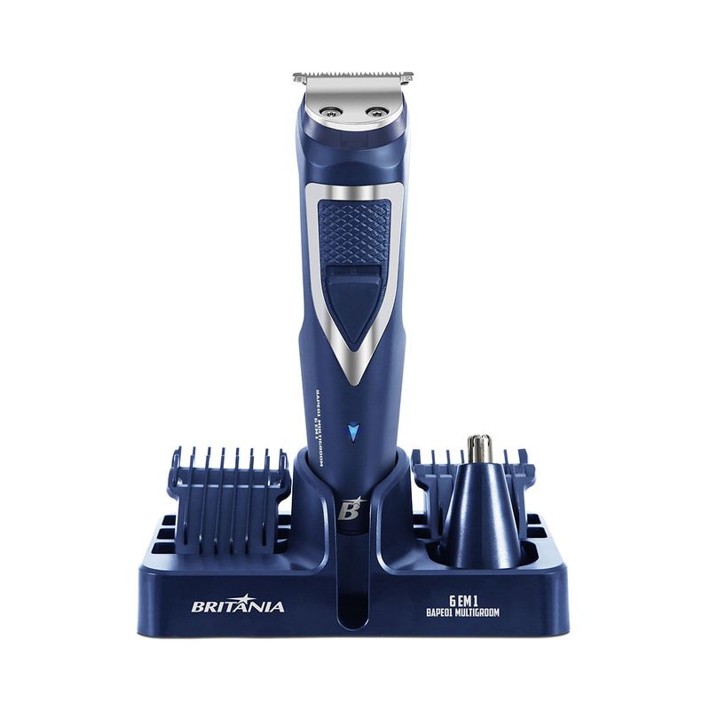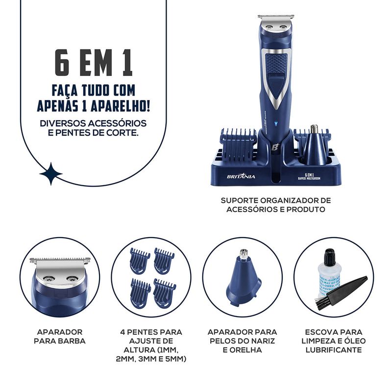 Buscando um aparador com diversas funções? Conheça o Aparador de Pelos Britânia 6 em 1 BAPE01 Multigroom! Com funcionamento com e sem fio, escolha a forma de utilização do aparelho de acordo com a sua necessidade. Além disso, possui bateria de lítio com autonomia de carregamento de até 90 minutos. O Aparador de Pelos Britânia 6 em 1 BAPE01 Multigroom permite que faça tudo com penas 1 aparelho, pois conta com diversos acessórios e pentes de corte para pelos. Possui ainda lâminas em inox, laváveis, que garantem maior durabilidade, além de não irritarem a pele ou puxar os pelos. O design ergonômico é leve e prático e pode ser usado na pele seca, úmida ou molhada. Com luzes indicadoras, seu Aparador de Pelos Britânia 6 em 1 BAPE01, indica quando o aparelho está em funcionamento – luz azul – e o nível de bateria – luz vermelha. Além disso, possui suporte organizador, para que possa armazenar todos os acessórios do produto juntos de forma organizada e reduzindo o espaço. • Lâminas laváveis • Lâminas em aço inoxidável • Bivolt automático • Luz indicadora de nível de bateria • Luz indicadora de funcionamento • Funcionamento com e sem fio • Carrega na base • Tempo de carga de 90min • Autonomia de uso de 90min • Bateria de lítio • Pode ser usado na pele seca, úmida e molhada • Suporte para acessórios • Aparador de bigode e costeletas • Aparador de nariz e orelha • Pentes de corte nos tamanhos 1mm, 2mm, 3mm, 5mm • Escova para limpeza das lâminas • Óleo lubrificante • Base organizadora • Tamanho do cordão de 90cm.