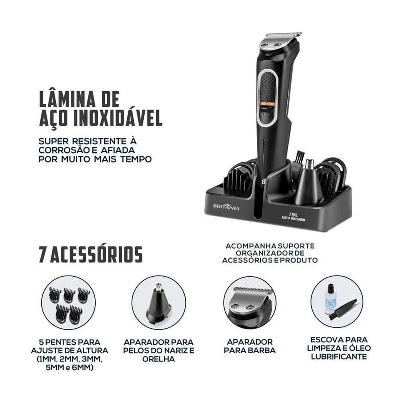 Transforme Seu Visual com 7 Funções em 1 Único Aparelho!Já imaginou ter a funcionalidade de 7 produtos em 1, revolucionando sua rotina de beleza e higiene? Com o inovador Aparador de Pelos Britânia Multigroom 7 em 1, esse sonho se torna realidade! Ele foi criado para você que busca a perfeição em cada detalhe, mantendo um visual impecável do rosto ao corpo, com a máxima praticidade.Precisão e Conforto em Suas Mãos:Experimente uma usabilidade prática e intuitiva que apara, raspa e remove os pelos indesejados com uma suavidade incomparável. Diga adeus às irritações! As lâminas em aço inox de alta performance, com pontas arredondadas e acabamento hipoalergênico, garantem um contato suave com a pele, mesmo as mais sensíveis. Obtenha um barbear rente e preciso, apare a barba, bigode e costeletas com maestria, e livre-se dos pelos do nariz, orelhas e sobrancelhas de forma eficiente e indolor. O design ergonômico do cabo oferece um manuseio perfeito, permitindo que você mude e reinvente seu estilo sempre que desejar!Liberdade Sem Fio e Conveniência Absoluta:Sua vida exige agilidade e liberdade. Por isso, o Britânia Multigroom é totalmente sem fio e recarregável, o parceiro ideal para sua rotina, seja em casa, na academia ou em viagens. Com uma autonomia impressionante de 90 minutos de uso após apenas 90 minutos de carga, e funcionalidade bivolt automático, ele está sempre pronto. O suporte exclusivo para o produto e todos os acessórios (pentes de corte 1mm, 2mm, 5mm, 6mm, aparador de nariz e orelha, escova de limpeza, óleo lubrificante) garante armazenamento organizado e recarga com total praticidade. Use-o na pele seca, úmida ou molhada – a versatilidade que você precisa!Recursos que Elevam Sua Experiência:Lâminas laváveis: Facilidade máxima na limpeza e manutenção. Lâminas em aço inoxidável: Durabilidade e corte preciso por muito mais tempo. Bivolt automático: Perfeito para qualquer tomada, em qualquer lugar do mundo. Luz indicadora de nível de bateria: Sempre saiba quando é hora de recarregar. Luz indicadora de funcionamento: Confirma que seu aparelho está pronto para usar. Funcionamento com e sem fio: Flexibilidade total de uso. Carrega na base: Organização e praticidade no dia a dia. Tempo de carga de 90min: Recarga rápida para sua conveniência. Autonomia de uso de 90min: Desfrute de longos períodos de uso sem interrupções. Pode ser usado na pele seca, úmida e molhada: Sua escolha, seu conforto. Suporte para acessórios: Mantenha seus pentes e aparadores organizados. Aparador de nariz e orelha: Cuidado completo para todas as áreas. Pentes de corte nos tamanhos 1mm, 2mm, 5mm e 6mm: Versatilidade para diferentes estilos e comprimentos. Escova para limpeza das lâminas e Óleo lubrificante: Para a longevidade e performance do seu aparelho. Bateria de lítio: Tecnologia de ponta para maior durabilidade e eficiência.Não é apenas um produto, é a liberdade de expressar seu estilo com confiança e praticidade! Adquira já o seu Aparador de Pelos Britânia Multigroom 7 em 1 e sinta a diferença.