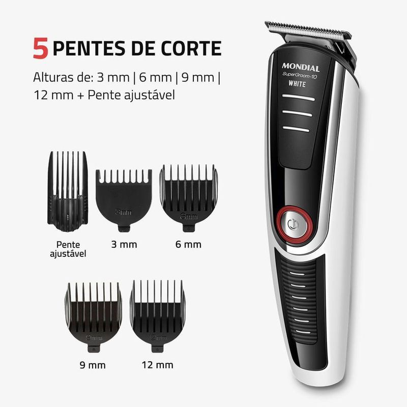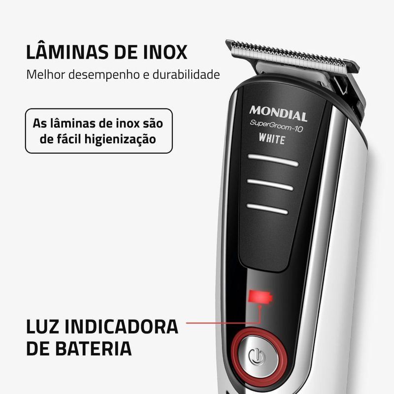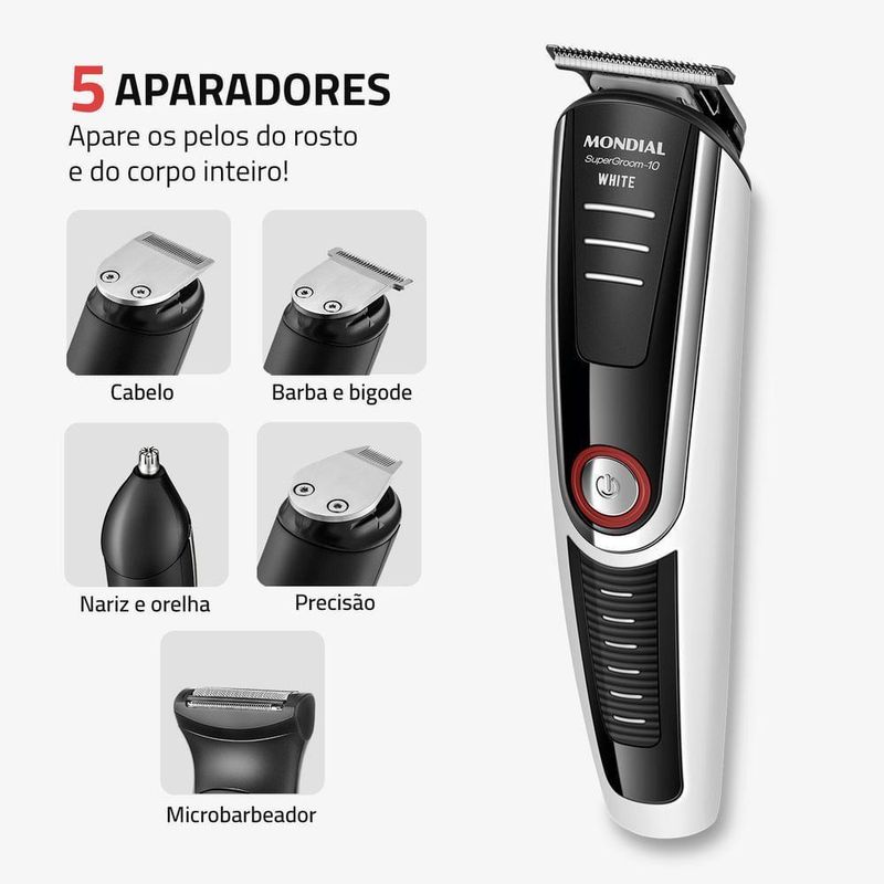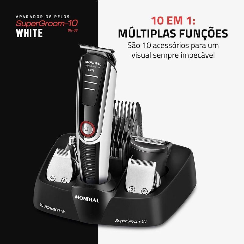 Aparador De Pelos Supergroom Mondial Bg-08 BivoltModelo - BG-08Cor - Preto/BrancoVoltagem (Tensão) - BivoltItens inclusos - 01 Aparador de Pelos Completo; 04 Cabeças Aparadoras; 04 Pentes de Corte; 01 Base Carregadora; 01 Pente Ajustável; 01 Óleo Lubrificante; 01 Carregador e 01 Manual de Instruções.Lâmina - InoxRecarregável - SimAlimentação - Bateria RecarregávelTipo de tomada - 10AUso seco ou molhado - SecoFunções - Aparar, Raspar e BarbearPeso - 0,134kgUso sem fio - SimIndicador de bateria - NãoGarantia - 01 anoMarca - Mondial