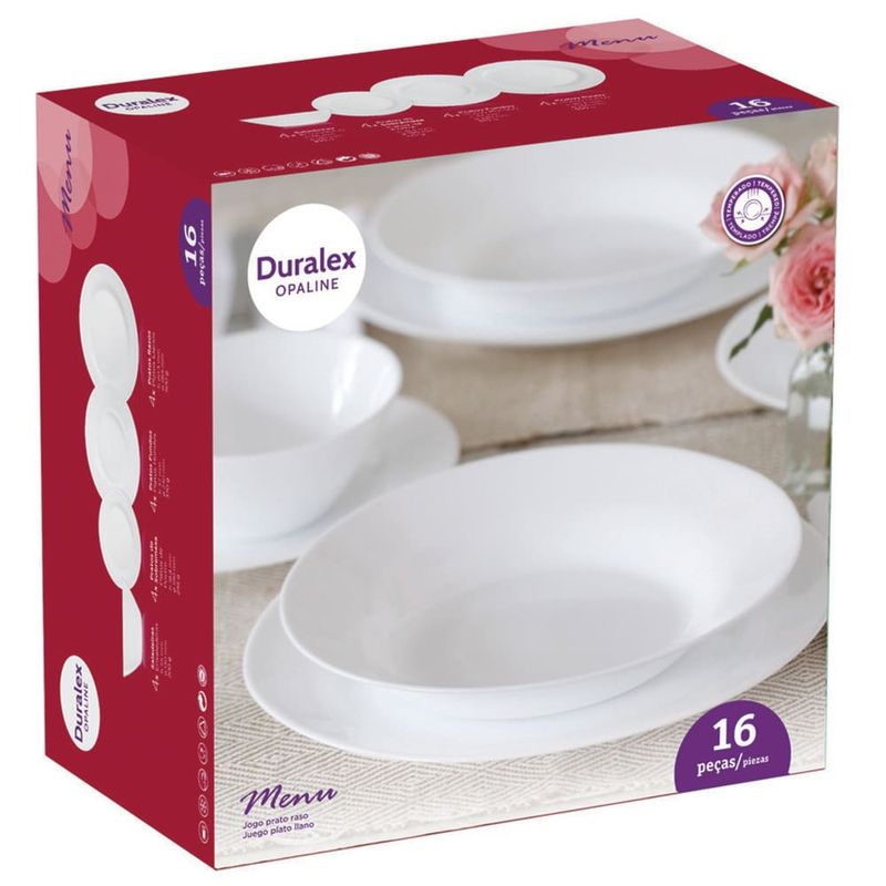 Elegância e praticidade à mesa com o Aparelho de Jantar Duralex Menu. Vem com pratos rasos, fundos e de sobremesa e saladeiras, ideais para você servir as refeições completas a até 4 pessoas. As 16 peças são produzidas em vidro temperado, resistentes a impactos e podem ser levadas ao micro-ondas e lava-louças.