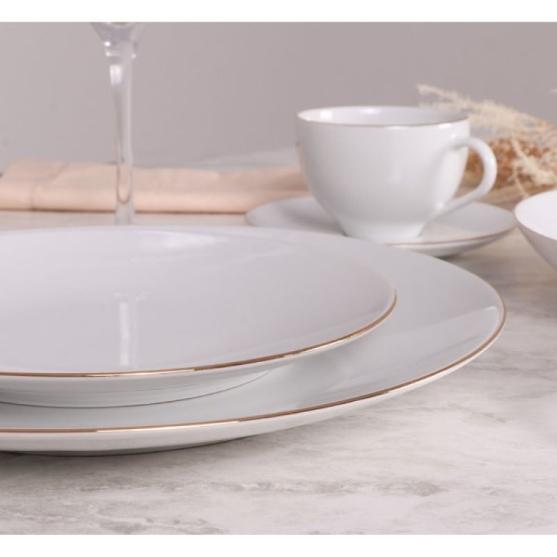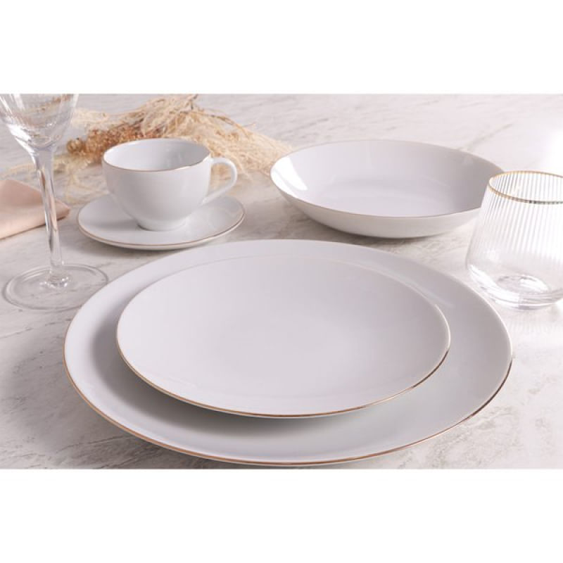 Aparelho de Jantar Tramontina Anna em Porcelana Decorada 20 Peças Jogo de Pratos Tramontina - O aparelho de jantar Tramontina em porcelana 20 peças da coleção Anna traz elegância e requinte para servir até 4 pessoas. Com bordas delicadamente decoradas com filete de ouro, cada peça reflete exclusividade e beleza. Seja para reuniões intimistas ou momentos especiais, este conjunto é perfeito para quem busca elevar a experiência à mesa. Características Gerais do Produto: Garantia: • 3 Meses