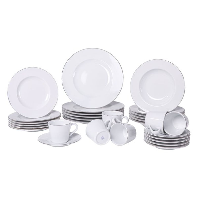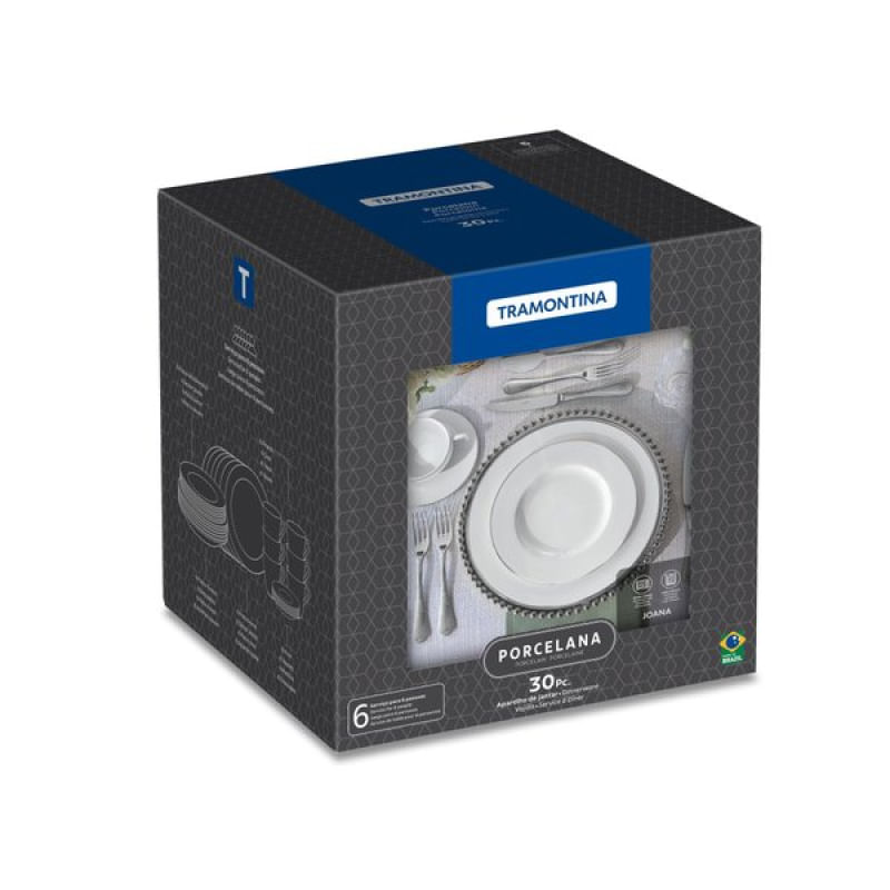 Aparelho de Jantar Tramontina Joana em Porcelana Decorada 30 Peças Tramontina - Com o aparelho de jantar Tramontina 30 peças da coleção Joana, suas ocasiões ganham um toque exclusivo e requintado. Composto por peças adornadas com um elegante filete de prata, ele serve até 6 pessoas, sendo perfeito para quem deseja impressionar com uma mesa posta que exala sofisticação e cuidado nos detalhes. Características Gerais do Produto: Garantia: • 3 Meses
