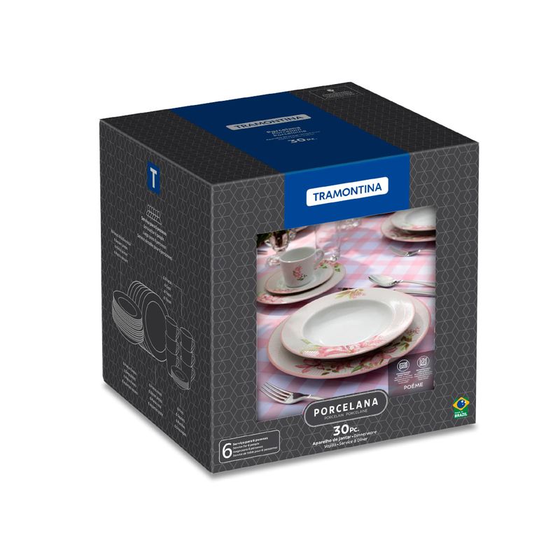 O aparelho de jantar Tramontina em porcelana 30 peças da coleção Poème serve até 6 pessoas, com um design encantador que mistura tons suaves de rosa e detalhes florais. Perfeito para ocasiões especiais, oferece elegância e praticidade, sendo compatível com micro-ondas e lava-louças.