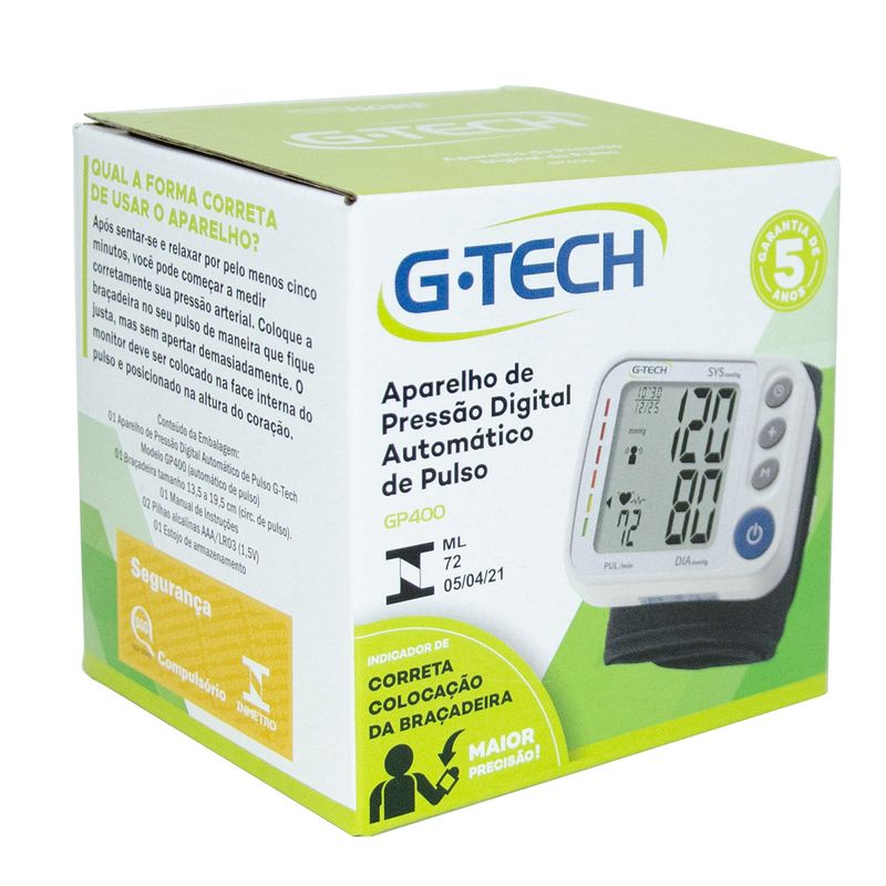 APARELHO DE PRESSÃO DIGITAL PULSO AUTOMÁTICO GP 400 G-TECH A linha G-TECH Home de aparelhos de pressão digitais, permite a monitorização residencial da pressão arterial, extremamente importante no controle da hipertensão e outras doenças do coração, sempre com total segurança e praticidade no uso. O Aparelho de Pressão Digital G-TECH Home GP400 apresenta as mais modernas tecnologias, tornando o ato de aferir os níveis de pressão arterial, muito mais prático e seguro, aumentando a adesão ao tratamento. Aparelho de Pressão Digital G-TECH Home GP400 possui: - Indicador de correta colocação da braçadeira- Indicador de arritmia cardíaca- Média das três últimas medições- 240 Memórias com hora e data- Dupla zona de memória- Indicador de movimentação excessiva- Aprovado pela Sociedade Brasileira de Hipertensão- Pilhas e Estojo para transporte - Anvisa: 80275319016 - 5 anos de garantia