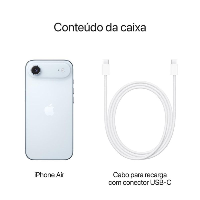 iPhone Air, O iPhone mais fino já produzido! - Design ultrafino, maior durabilidade e processamento Pro! Apple iPhone Air 256GB 6,5" 48MP Azul-Céu tem apenas 5,6mm de espessura e pesa 165g. Tela brilhante de 6,5 polegadas, estrutura de Titânio, processador A19 Pro, câmera traseira de 48 MP e bateria de longa duração.Confira todos os detalhes e inovações Apple para este iPhone: Novo Design Ultrafino em TitânioEstrutura feita em titânio Grau 5, sendo 80% dele reciclado. O iPhone Air é tão resistente quanto irresistível. Ceramic Shield - Agora, a parte de trás do iPhone Air é protegida com Ceramic Shield, 4x mais resistente a rachaduras. Enquanto o novo Ceramic Shield 2 deixa a tela 3x mais resistente a arranhões.Tela de 6,5” Tela de 6,5 polegadas, muito mais brilhante e com mais leveza ao navegar, melhor contraste em ambientes externos com 3.000 nits de pico de brilho e 33% menos reflexos.Sistema de CâmerasCâmera Frontal Center Stage de 18 MP – Para selfies mais inteligentes, com flexibilidade ao enquadrar. Vídeos com capturas dupla para gravação simultânea das câmeras frontal e traseira.Câmera Traseira Câmera Fusion de 48 MP, Duas Câmeras avançadas em uma. Sistema de câmera Fusion de 48 MP e zoom de 2x com qualidade óptica, que permite o enquadramento de foto perfeita sem sair do lugar.Processador A19 ProConta com GPU de 5 núcleos e Neural Accelerators aprimorado dá conta de tudo o que você faz no iPhone, incluindo a Apple Intelligence e jogos AAA (mais avançados). 256GB ArmazenamentoCom capacidade de Armazenamento de 256GB para guardar tudo! Fotos, vídeos, documentos e momento incríveis!Bateria para o dia todo